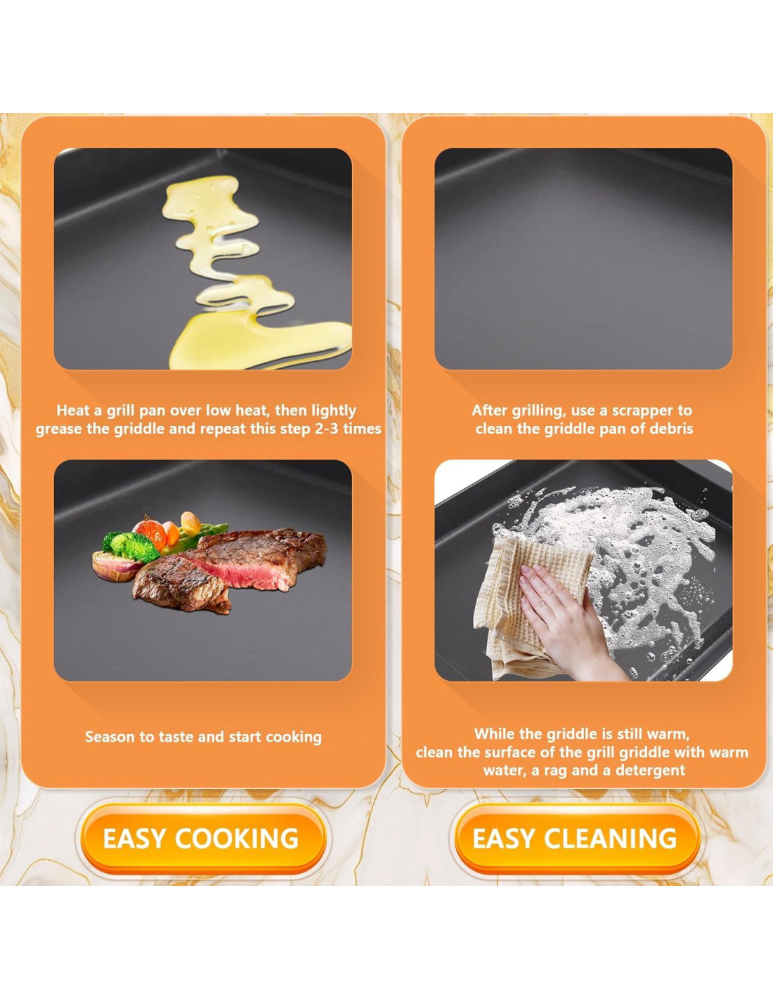 - Diseño Único: La parte superior de la parrilla de hierro fundido tiene lados lo suficientemente altos para asegurar que la comida no se caiga, lo que la hace adecuada para cocinar una amplia gama de alimentos al mismo tiempo. Esta parte superior de la plancha es lo suficientemente grande para que prepares una comida completa a la vez y aumentes tu eficiencia en la cocina. Es ideal para panqueques, kebabs, hamburguesas, huevos, tocino, verduras, salmón y más. La plancha de horno con diseño de asas facilita mover y ajustar la posición y colocación de la placa de la plancha de fondo plano.