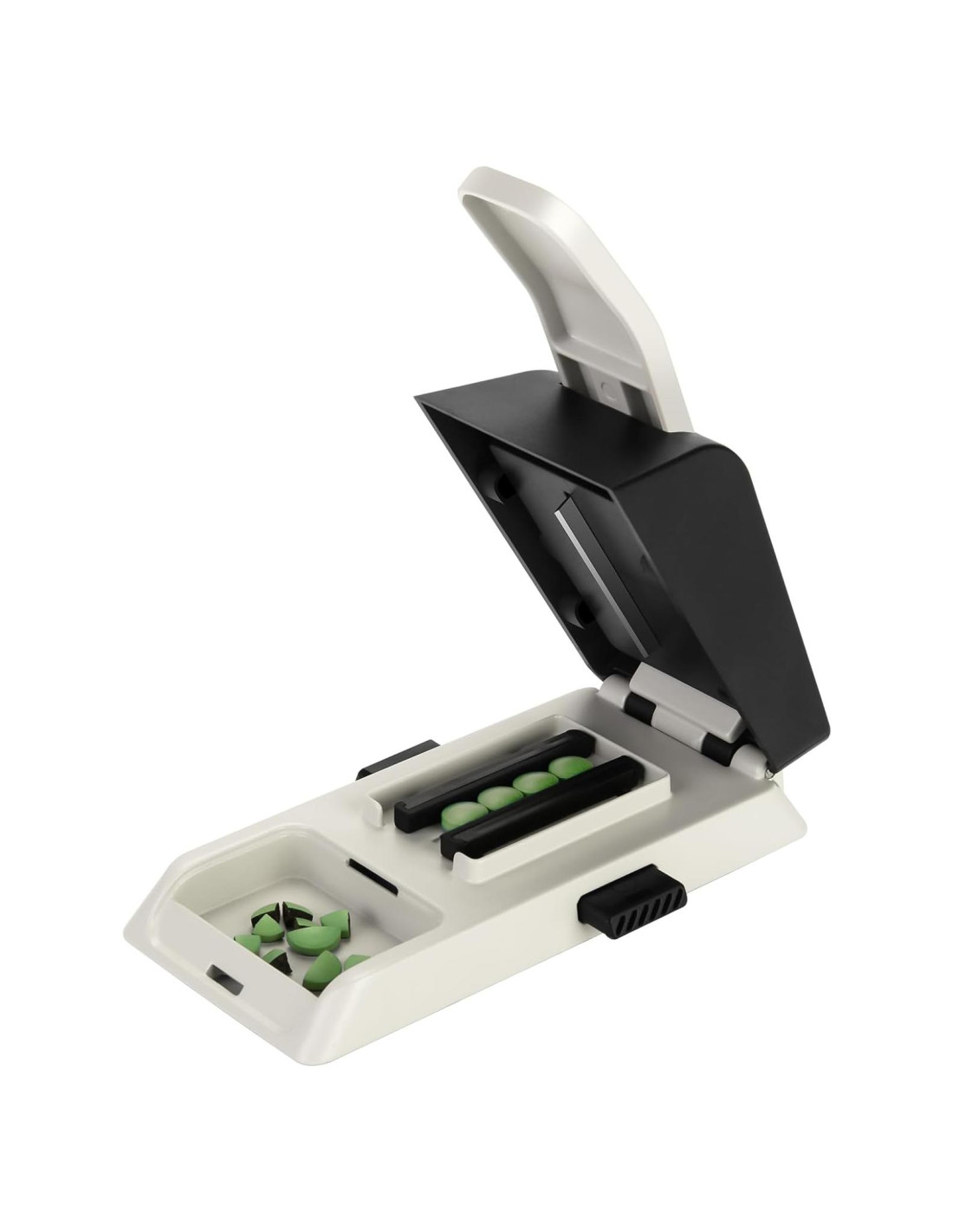 - [Fácil de usar] El diseño del interruptor de enlace de presión lateral hace que sea más conveniente y eficiente colocar las pastillas. El diseño de la cuchilla curva asegura una segmentación uniforme de cada pastilla. El corte preciso divide la pastilla en un cuarto y en medio.