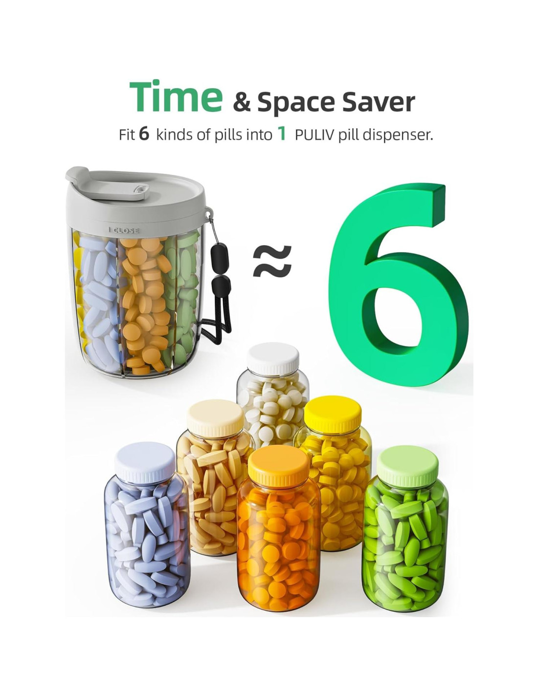 - Viaja sin complicaciones: Si estás buscando un contenedor de pastillas para viajes largos, el organizador de medicamentos de viaje PULIV es tu asistente de viaje ideal. La botella organizadora de suplementos está equipada con un asa de nylon para una carga de 6 kg, lo que facilita llevarla contigo. Disfruta de tu viaje relajante y libre