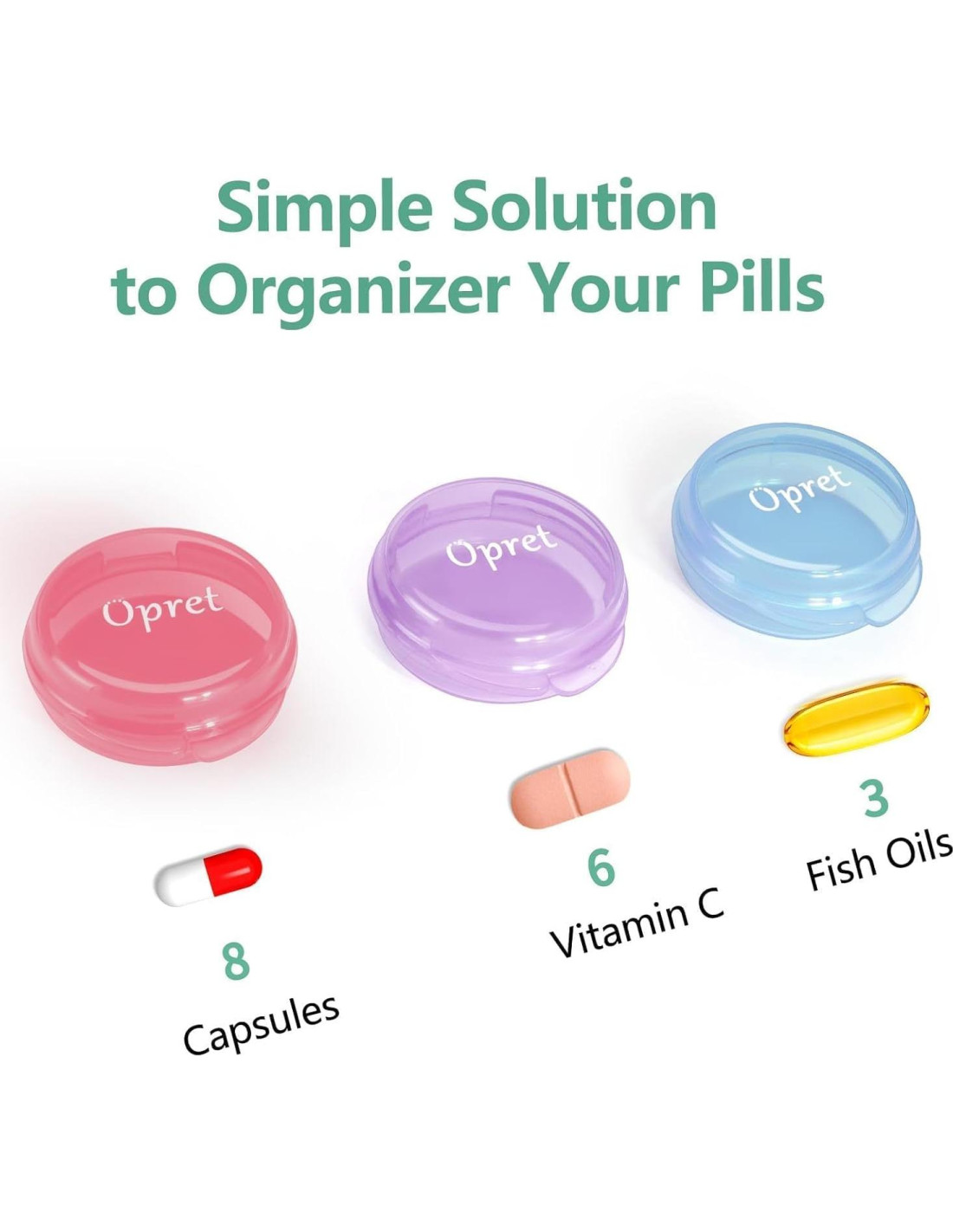 Rellenador de Cápsulas de Acero Inoxidable, cinco tamaños en un paquete, adecuado para diferentes usos. Diseño colorido. Fácil de abrir y llevar. La tapa se cierra de forma segura. Pequeño y ligero. Material PP de grado alimenticio. Cápsula - 8 pcs. Vitamina - 6 pcs. Aceite de Pescado - 3 pcs. No tienes que preocuparte por las pastillas que se salgan o se pierdan. El tamaño de esta caja de pastillas portátil es 4.06x4.06x1.68 cm. Es pequeña y ligera. Puedes ponerla en tu bolsa o bolsillo sin ocupar espacio. Perfecta para viajar y trabajar.