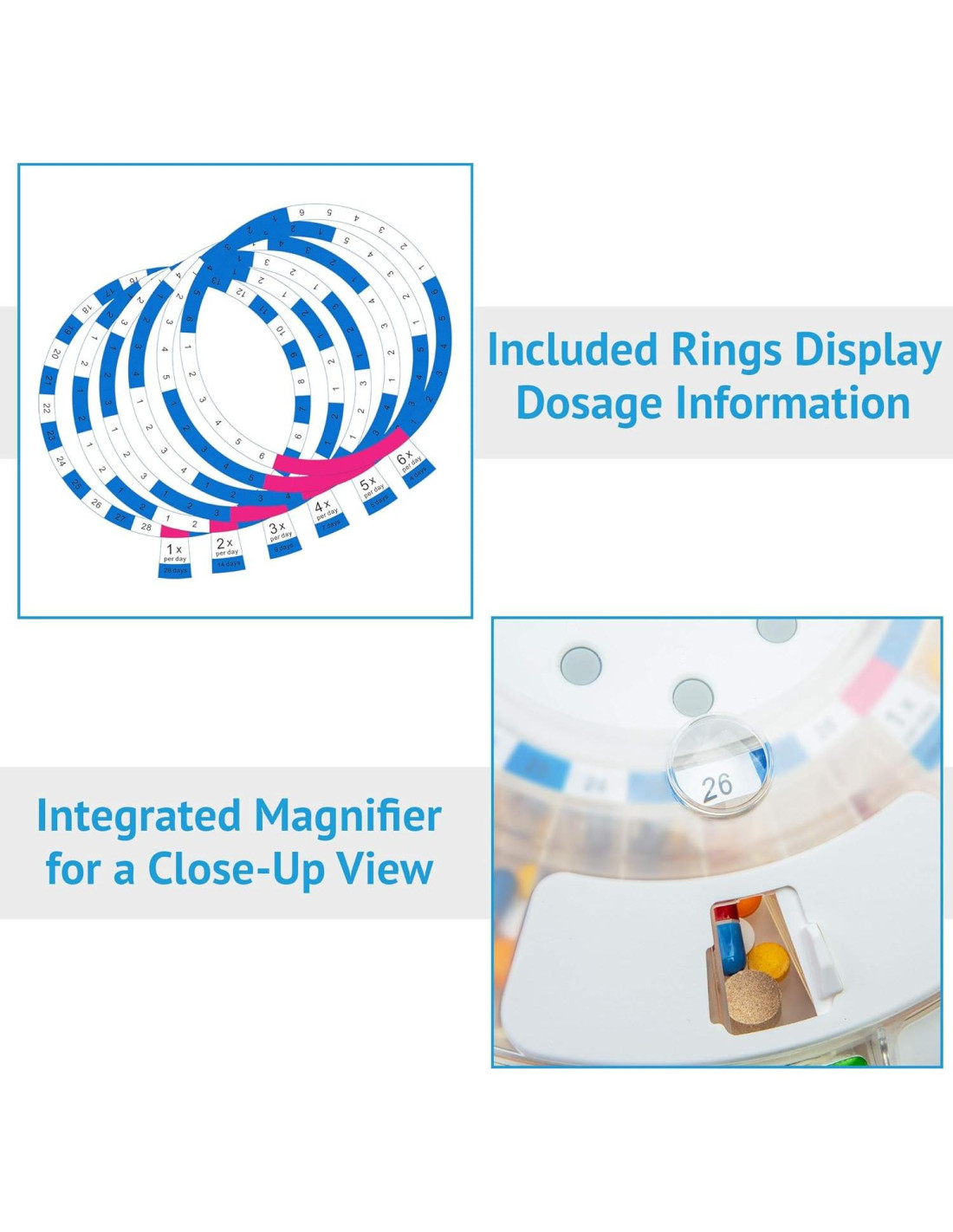 - 6 ANILLOS DE DOSIFICACIÓN INTERCAMBIABLES | Las Plantillas Ayudan a Mejorar la Precisión y Prevenir Dosis Perdidas o Dobles Accidentales | Compartimentos de Alta Capacidad que Aceptan Hasta 18 Pastillas Cada Uno para Mínimas Recargas y Máxima Eficiencia