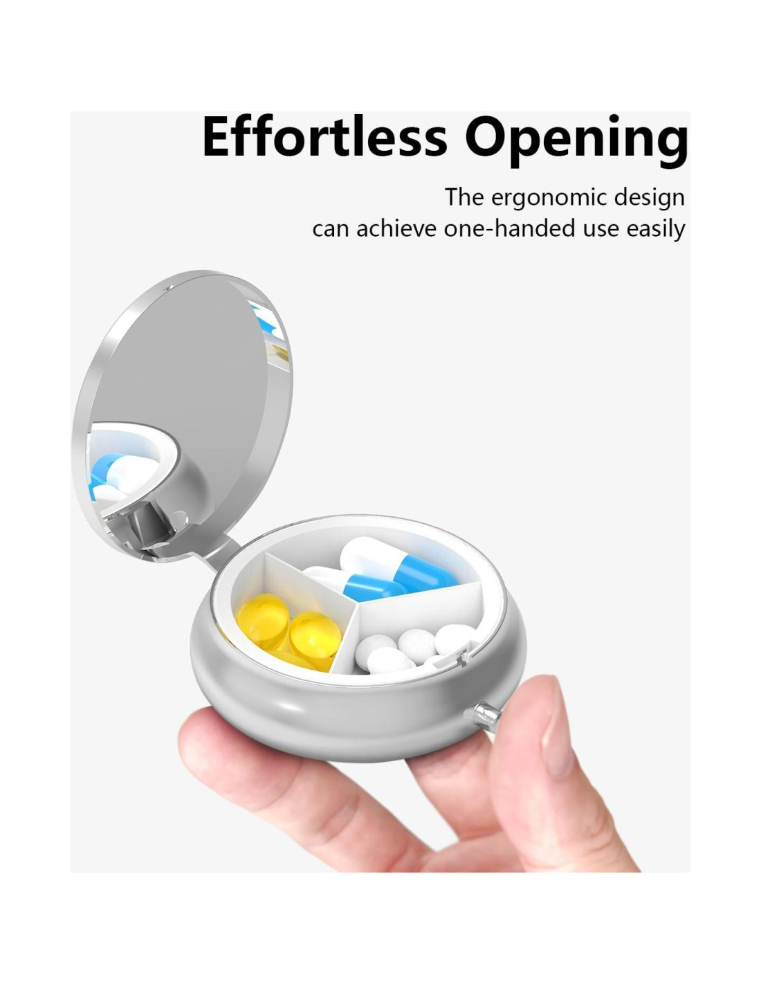 - Tamaño portátil: Nuestra mini caja de pastillas tiene 3 compartimentos, mide 5.08 cm de diámetro y 1.75 cm de grosor. Es compacta y ligera, cabe perfectamente en la palma de tu mano, ocupa poco espacio y se desliza fácilmente en tu billetera y bolsillo, adecuada para viajes y uso diario. Perfecta para poner en tu bolso, mochila de viaje, maletín o el bolsillo trasero de tus jeans para medicamentos diarios