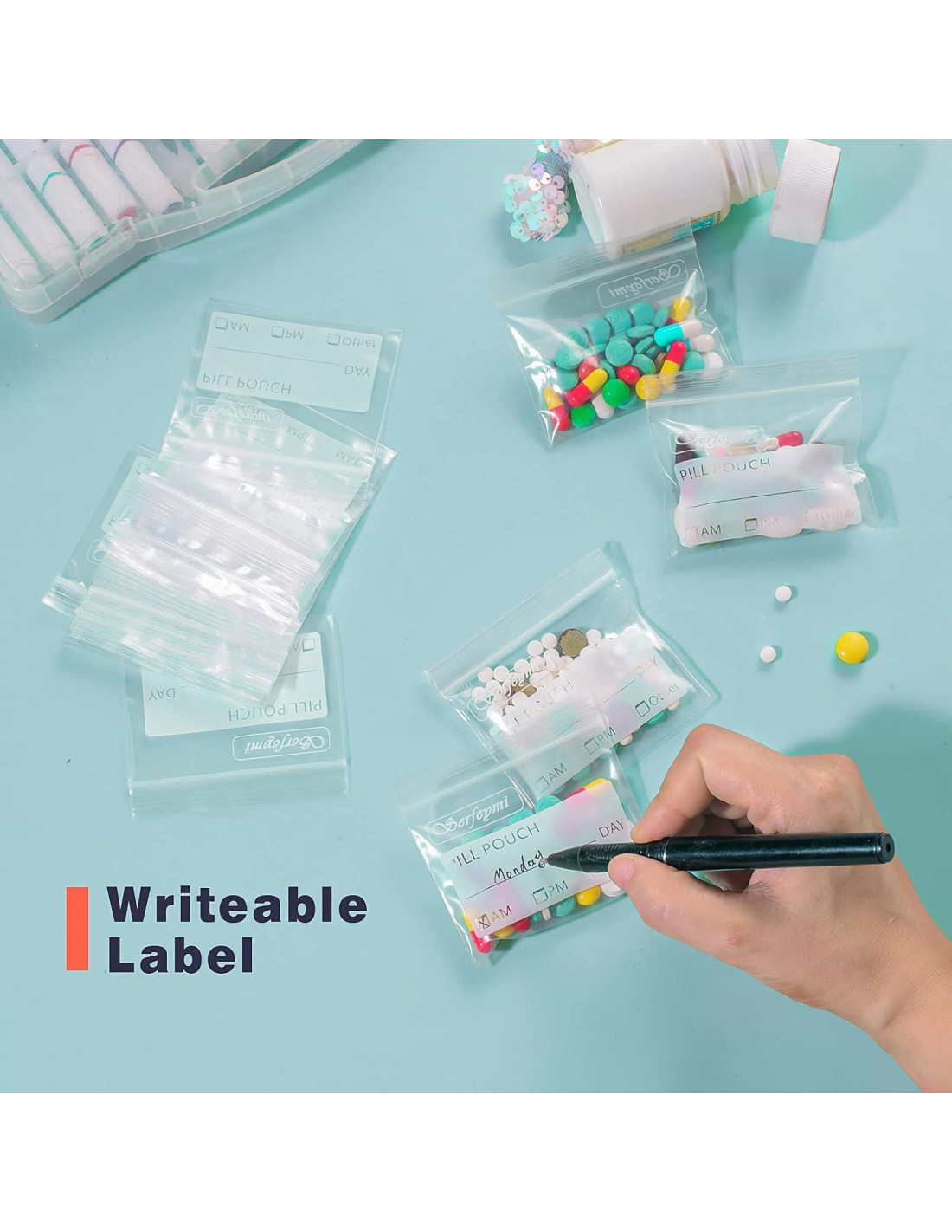 - CLARAS PARA QUE PUEDAS VER LO QUE HAY DENTRO CON ETIQUETAS ESCRIBIBLES: Nuestras bolsas de pastillas son la solución perfecta para tus necesidades de almacenamiento de medicamentos y tienen un lado claro escribible. Lo que eso significa para ti es que puedes ver qué medicamento estás guardando y etiquetarlo solo para estar seguro. Lo que eso significa para ti es que nunca tendrás que preguntarte qué pastillas has recordado o olvidado, así que puedes gestionar tus pastillas y recordatorios de medicamentos de manera más precisa que nunca.