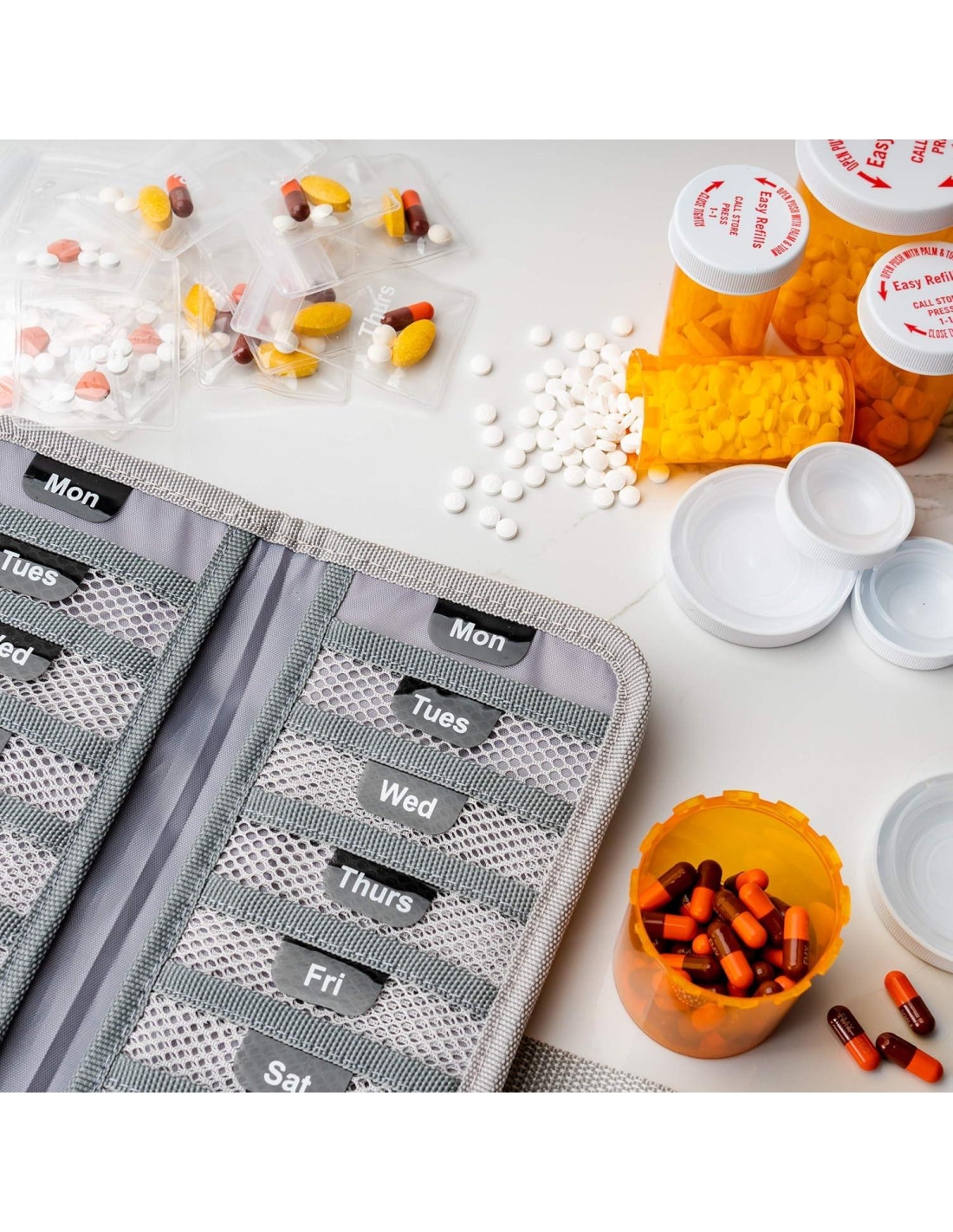 - HECHO PARA DURAR - Nuestro estuche de pastillas de viaje está hecho de tela de alta calidad que garantiza un uso duradero. Nuestras bolsas individuales de cierre deslizante etiquetadas son meticulosamente elaboradas para almacenar tus pastillas de manera segura.