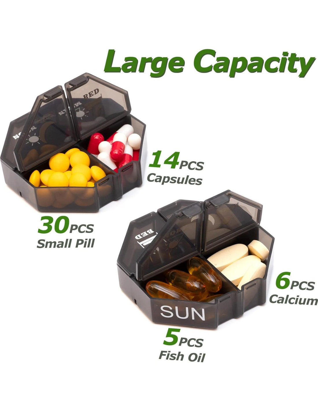 - Gran Capacidad: El organizador de pastillas tiene 7 organizadores de vitaminas individuales, y tiene un total de 28 compartimentos grandes. Cada compartimento puede contener 30 pastillas pequeñas o 14 cápsulas o 6 calcio que pueden acomodar tus necesidades diarias de dosis