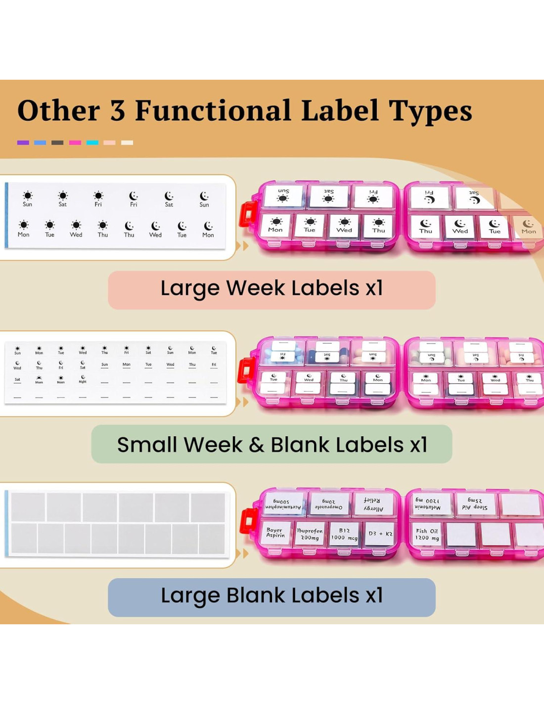 - 4 Tipos de Etiquetas Incluidas - 294 etiquetas de medicación/suplemento (transparente, precortadas, resistentes al agua), 1 hoja de etiquetas de fecha semanales preimpresas (14pcs/hoja), 1 hoja de etiquetas grandes en blanco para escribir (14pcs/hoja), y 1 hoja de etiquetas pequeñas semanales/en blanco para escribir (40pcs/hoja). Una variedad de etiquetas para satisfacer todas tus necesidades de organización. Consulta las Imágenes 2, 3 y 4 para más detalles.