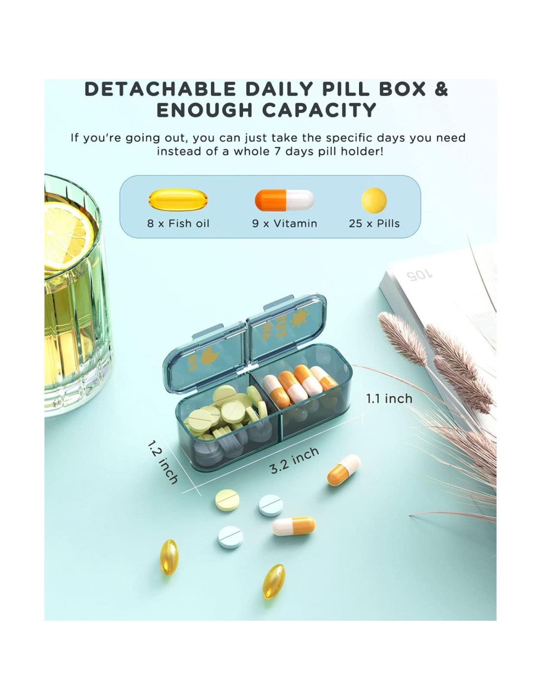 7 casos individuales de pastillas desmontables están etiquetados en diferentes días. Si estás fuera, puedes llevar solo el día específico que necesitas en lugar de toda la semana.