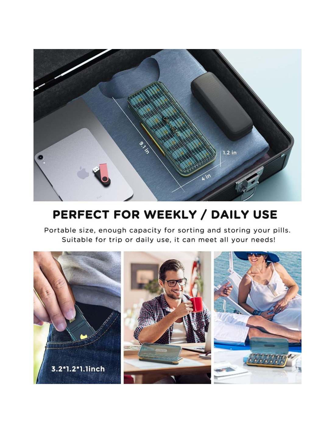 - Almacena Medicamentos de 7 Días (2 Veces al Día) y Fácil de Rastrear: Este lujoso organizador de pastillas 2 veces al día clasifica y llena los medicamentos de una semana por adelantado de una vez, ayudándote a evitar la acción repetitiva diaria de organizar manualmente tus pastillas y ahorrando tiempo. Los íconos de semana de color claro y las letras am/pm en la tapa de la caja de pastillas pequeña te recuerdan tomar la dosis correcta cada día, rastreando y manteniendo fácilmente tu régimen de medicamentos diario am/pm. Organizador de pastillas Acedada - tu asistente inteligente de medicamentos.