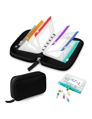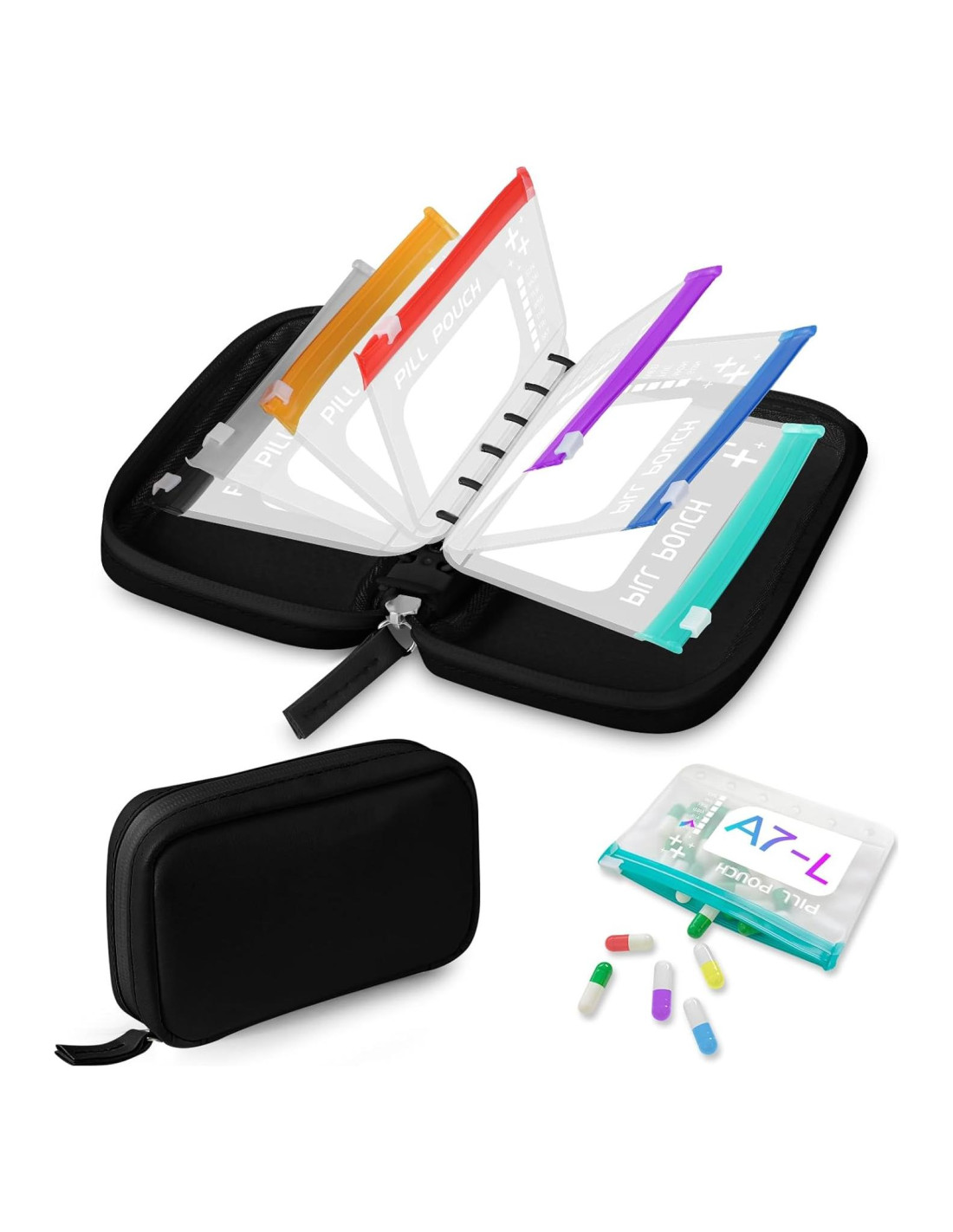 - BOLSA DE ORGANIZADOR DE PASTILLAS ESTILOSA - La bolsa organizadora de pastillas Timueetech incluye un binder, emparejado con 7 bolsas de EVA, que se pueden usar para almacenar tus pastillas y medicamentos, o pequeñas joyas como aretes, anillos, etc.