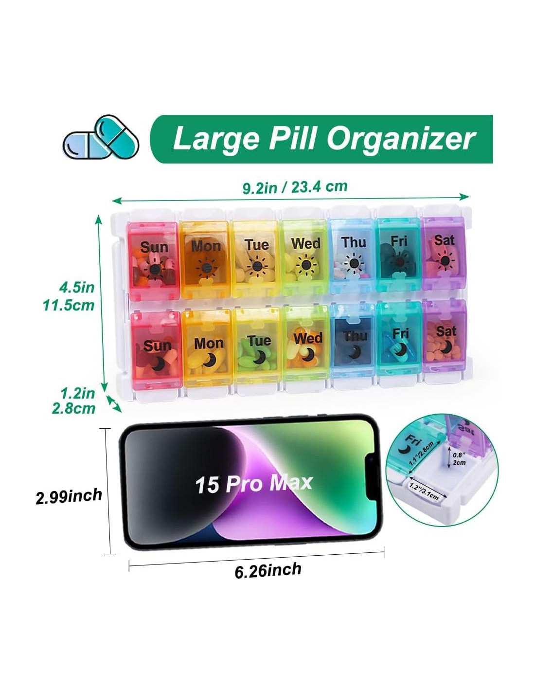- Organizador de Pastillas 2 Veces al Día - La caja semanal de pastillas tiene 2 filas para la mañana y la noche y compartimentos cubiertos individuales, lo que la hace muy conveniente de usar. Cada compartimento mide 3.05 x 2.79 x 2.03 centímetros de profundidad, lo suficientemente grande para contener tus medicamentos diarios, vitaminas, aceite de pescado y suplementos.