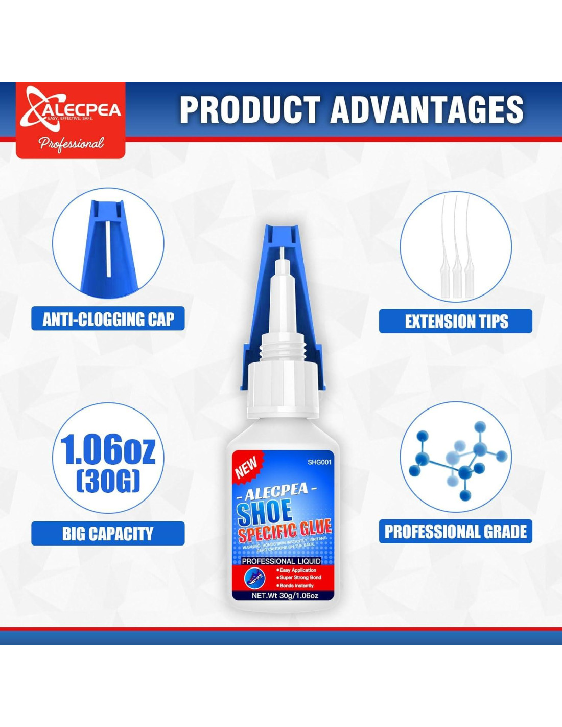 - GARANTÍA DE RESTAURACIÓN DE ZAPATOS - ALECPEA es sinónimo de restauración de zapatos de calidad profesional. Nuestra botella de 30g viene con tres boquillas de precisión, permitiéndote abordar cualquier tarea de reparación de pegamento para zapatos con facilidad. Confía en nuestro pegamento para reparación de zapatos para revitalizar tu par favorito, con una garantía de satisfacción que cumple.