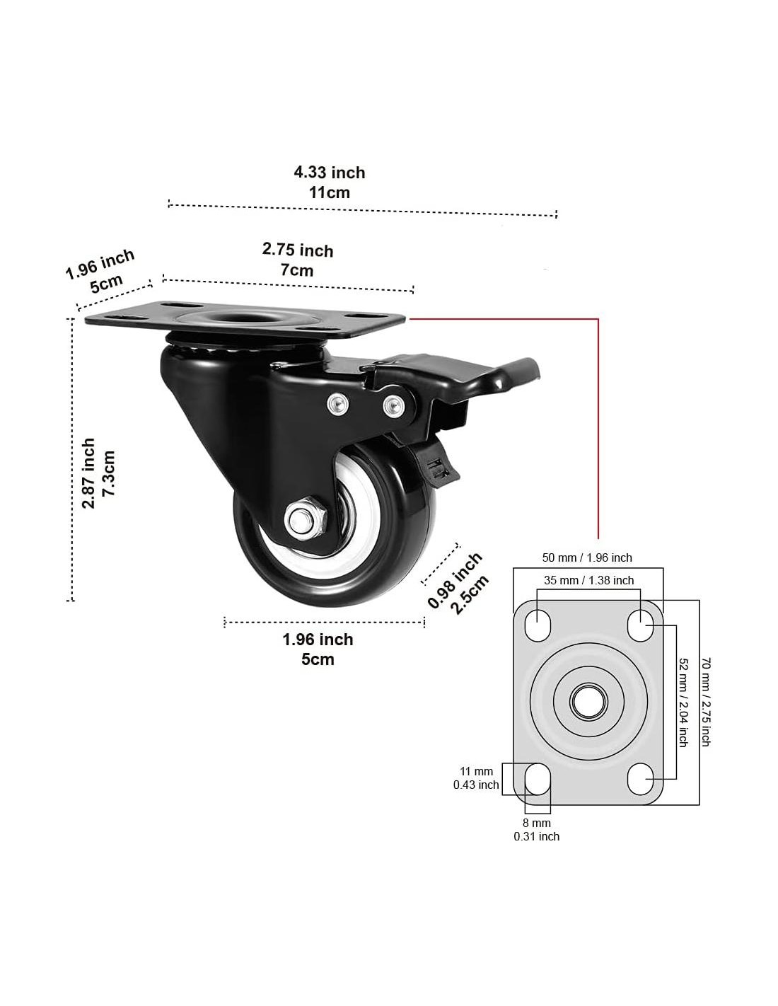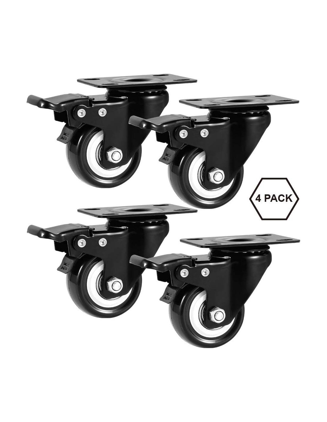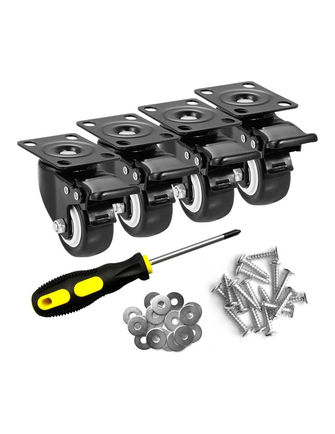 - Estándar: Un juego de 4 ruedas giratorias, ruedas giratorias de poliuretano (PU) de 2 pulgadas, una caja con destornilladores, tornillos y arandelas de hierro