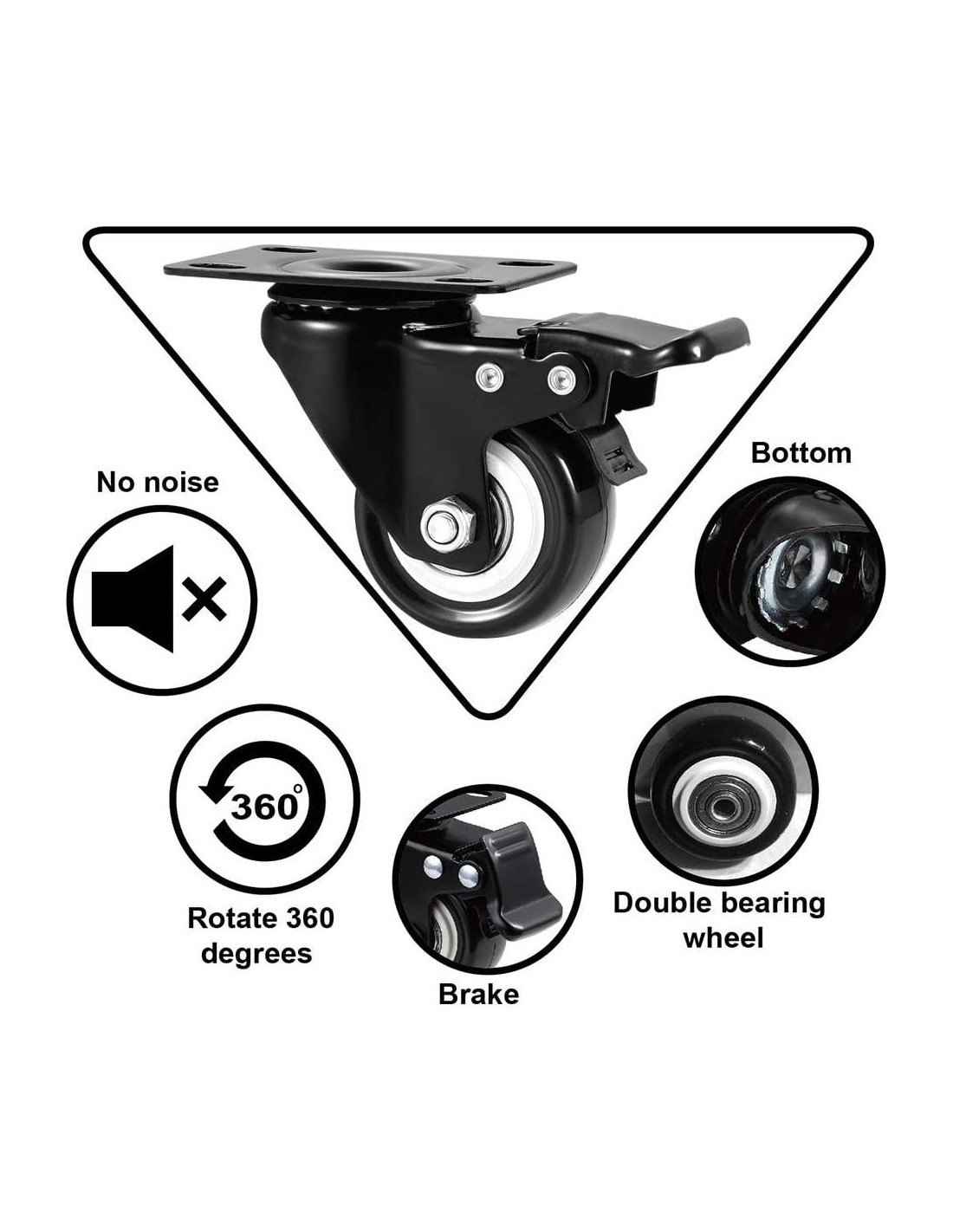- Doble freno: Nuestras ruedas giratorias de placa superior tienen doble freno, puede frenar la dirección de rotación de la placa inferior y la dirección de la rueda hacia adelante, lo que es fácil de operar.