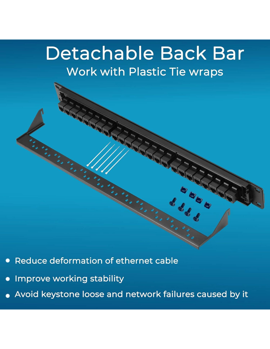 - Barra trasera desmontable incluida: Este panel de parcheo de montaje en pared contiene una barra trasera desmontable de acero grueso. Con bridas, puede reducir efectivamente la deformación del cable ethernet, mejorar la estabilidad de trabajo del puerto de conexión de red y evitar que el keystone se afloje y la ocurrencia de fallos de red causados por el aflojamiento y la deformación del cable. ¿Qué obtienes? 24 piezas de panel de parcheo de montaje en pared con keystone cat6 resistente, barra trasera de cable removible, tornillos, bridas.
