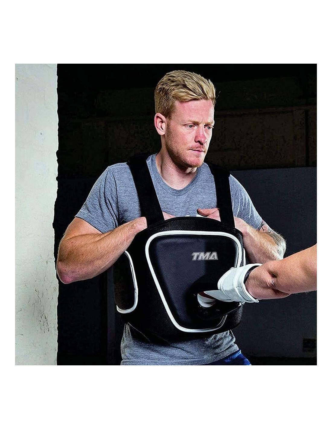 El Protector de Abdomen TMA Advance no es un protector de abdomen regular. Es ligero y duradero con un robusto sistema de correas que minimiza el movimiento. Está hecho con acolchado de gel de alto impacto integrado. Los protectores corporales de entrenamiento más cómodos, protectores y anatómicamente correctos fabricados. Gel integrado moldeado con un exterior resistente y un interior que absorbe super impactos con casi 3" (7.62 cm) de acolchado de alta densidad de múltiples capas con un adicional de 1/2" (1.27 cm) de espuma de baja densidad en la parte delantera y los lados. Perfecto para trabajar en todos los golpes al cuerpo, patadas y golpes al tronco. Usar en combinación con manoplas de golpeo y/o almohadillas tailandesas para un entrenamiento completo. Ajustable con gancho y lazo de talla única. Este guardabosques de boxeo ha sido diseñado para ofrecer la máxima protección contra todo tipo de golpes al cuerpo. Esencial para entrenadores con boxeadores de fuerte pegada.