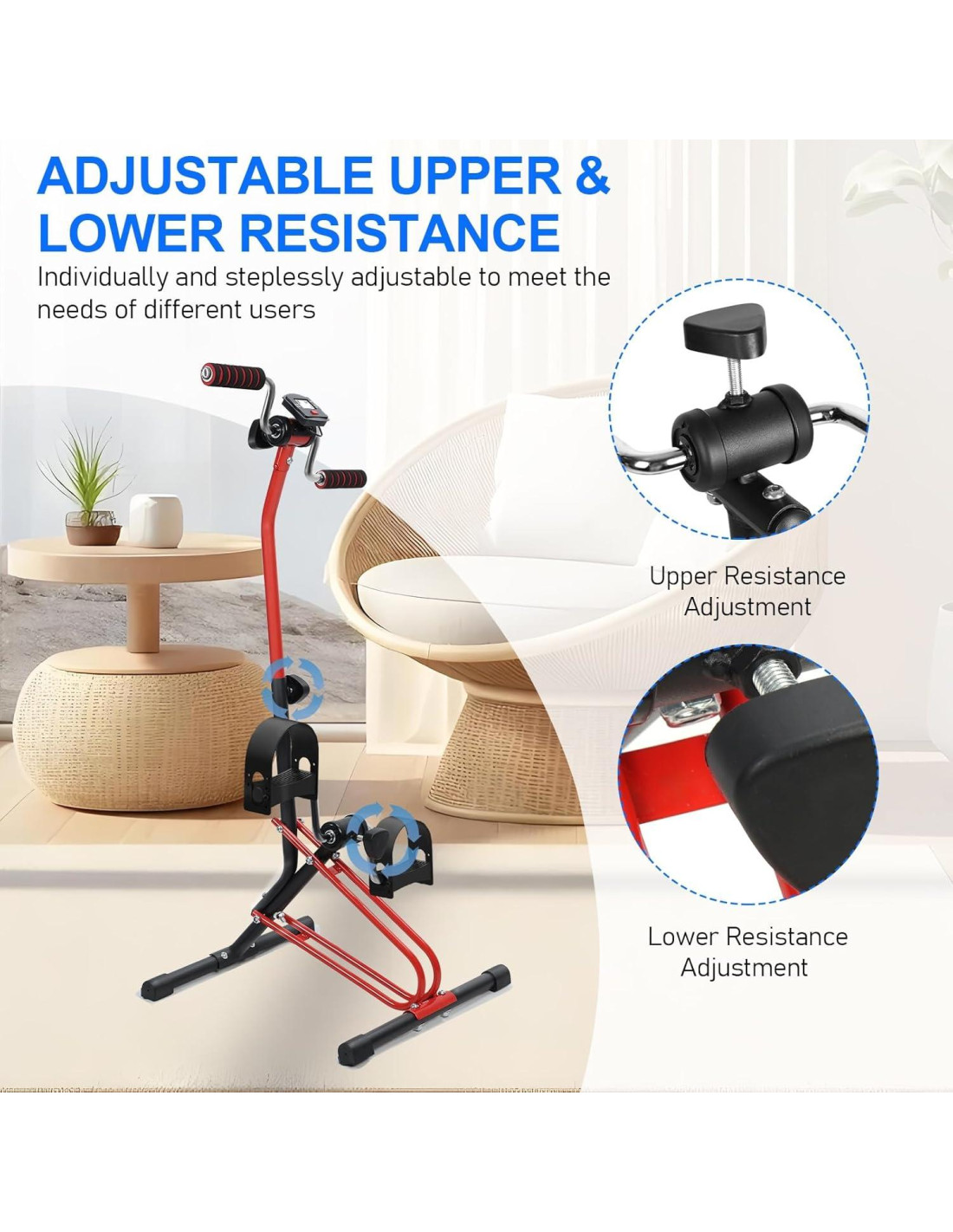 - Diseño Ajustable: La máquina de rehabilitación de extremidades superiores e inferiores tiene tensión y altura ajustables para permitirte trabajar brazos y piernas para un ejercicio seguro y de bajo impacto, todo desde la comodidad de tu silla o sofá
