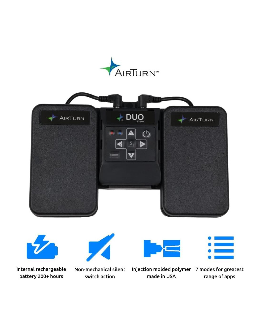 Con interruptores silenciosos y táctiles, el AirTurn DUO 500 es prácticamente indestructible y está diseñado para superar cualquier interruptor mecánico. Su diseño versátil, elegante y simple es una excelente opción para todo tipo de usuarios. Se ha convertido en el pedal Bluetooth preferido por los consumidores debido a su diseño de alta calidad y duradero. Cientos de aplicaciones compatibles. Mantén tus manos en tu tarea. No más cables que desordenen tu configuración. No más papeles volando o libros pesados que cargar. Cientos de aplicaciones compatibles para pasar páginas, teleprompter, leer música, desplazarse por letras y tablaturas, activar pistas de acompañamiento y efectos, enviar comandos MIDI, activar audio y luces, capturar fotos y videos, transmitir en vivo, ¡y mucho más! Siete modos integrados almacenan comandos de interruptores que funcionan con cientos de aplicaciones, incluidas aquellas compatibles con AirDirect. Crea comandos para casi cualquier aplicación que responda a pulsaciones de teclas, macros, clics de mouse o MIDI con el gratuito AirTurn Manager. Ajusta características como Repetición Automática, Tiempo de Inactividad, Bajo Consumo o Modo de Respuesta Rápida, y Rebote. Selecciona tipos de interruptores como Momentáneo, Retenido, Pulso o Comando. AirTurn Manager admite actualizaciones por aire del firmware para las últimas características. Completamente silencioso, acción de interruptor suave, sentido bajo el pie. Exterior moldeado de alta calidad completamente cerrado con interruptores no mecánicos. A más de 200 pies (61 metros), AirTurn lidera el rango operativo de la industria. La batería recargable proporciona más de 200 horas de tiempo de reproducción con una sola carga, muestra indicadores de estado y se apaga automáticamente cuando el dispositivo anfitrión se apaga. LED de estado Bluetooth. LED de estado de batería baja. Receptor extraíble para usar como un control remoto de mano o para usar con tu interruptor de mano, mordida o pie favorito. Elige emparejamiento abierto para conexiones instantáneas al cambiar entre dispositivos. Elige emparejamiento cerrado para almacenar una sola conexión y evitar conexiones no deseadas a otros dispositivos. Conéctate hasta ocho dispositivos AirTurn para más opciones de interruptores. Funciona con dispositivos que tienen Bluetooth 4 o superior. Cobertura de 2 años con registro del producto (incluye batería). AirTurn se especializa en pedales completamente personalizables y soportes ultra-portátiles. Con una gama completa de controladores y soportes, somos una tienda integral para equipos de música móvil y herramientas de creación de contenido. Controla tus aplicaciones favoritas con la presión de un interruptor de pie y mantén tus manos libres para tu tarea. Consulta nuestra selección completa de controladores inalámbricos y soportes portátiles para tabletas, y experimenta tu libertad para actuar. AirTurn se encuentra en Boulder, Colorado. Creamos el primer cambiador de páginas manos libres en 2008 y seguimos estableciendo el estándar para la innovación de pedales Bluetooth. Somos un equipo de músicos y entusiastas de la tecnología que utiliza los productos que fabricamos. Nos esforzamos por la mejor experiencia posible. Personalización: Establece pulsaciones de teclas, macros, clics de mouse o MIDI con el gratuito AirTurn Manager. Ajusta características como Repetición Automática, Tiempo de Inactividad, Bajo Consumo o Modo de Respuesta Rápida, y Rebote. Selecciona el tipo de interruptor como Momentáneo, Retenido, Pulso o Comando. Compatible con cientos de aplicaciones para música, teleprompter, video, iluminación y más.