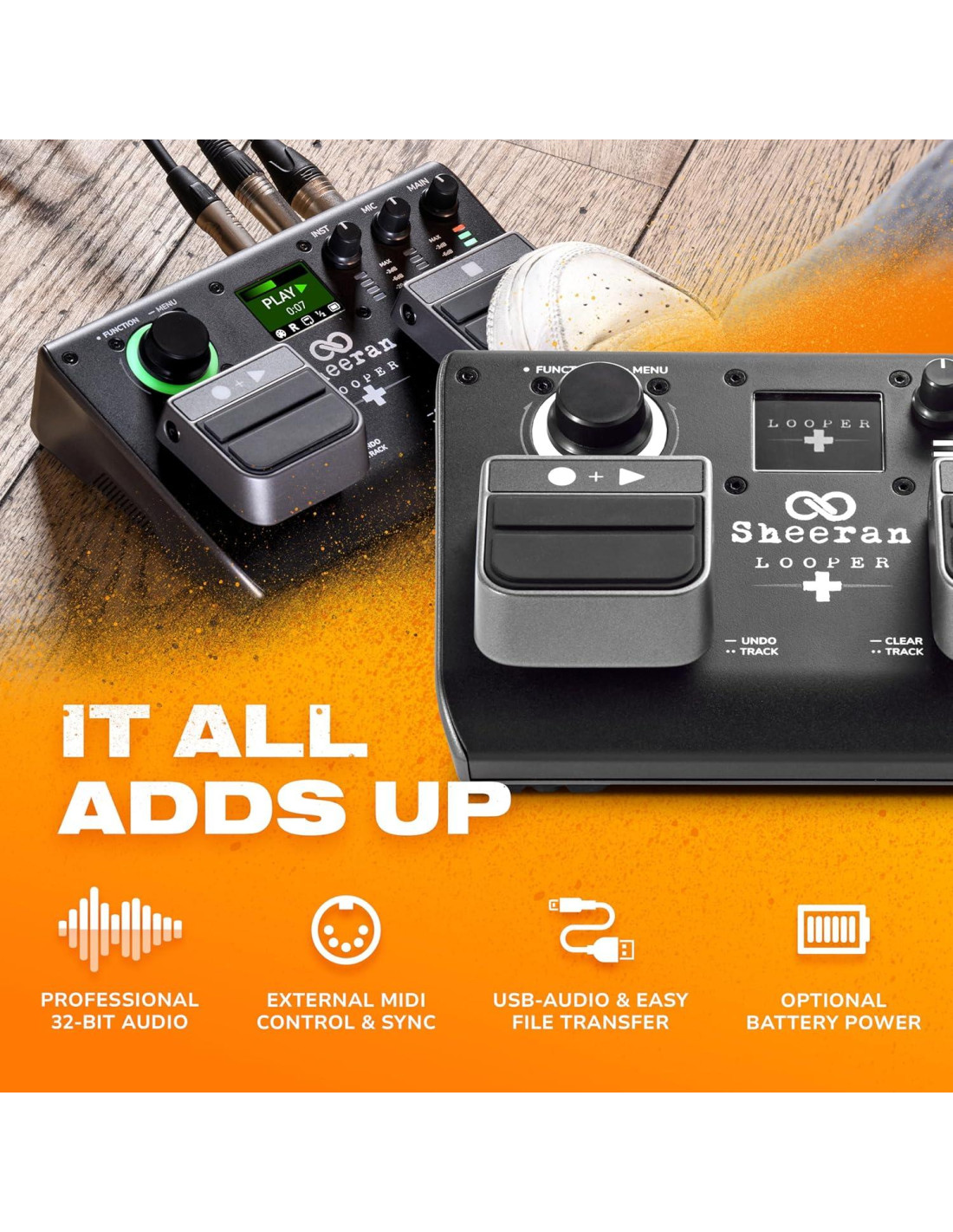 SHEERAN LOOPER + es el pedal looper de doble pista potente y portátil de nueva generación. LOOPER + cuenta con el flujo de trabajo de looper de Ed Sheeran, pedales de aluminio fundido de grado estadio y una pantalla color de 1.8" (4.57 cm) con anillo de estado de loop RGB LED para información de rendimiento. Diseñado por Ed y su equipo de producción, LOOPER + utiliza DSP personalizado alimentado por HeadRush que ofrece calidad de audio de clase líder y muchas opciones de conectividad para actuar en la calle, en el estudio o en el escenario. LOOPER + es el looper compacto perfecto, ya sea que estés comenzando o seas un músico profesional que busca actualizar su pedalera existente con un nuevo pedal looper intuitivo.