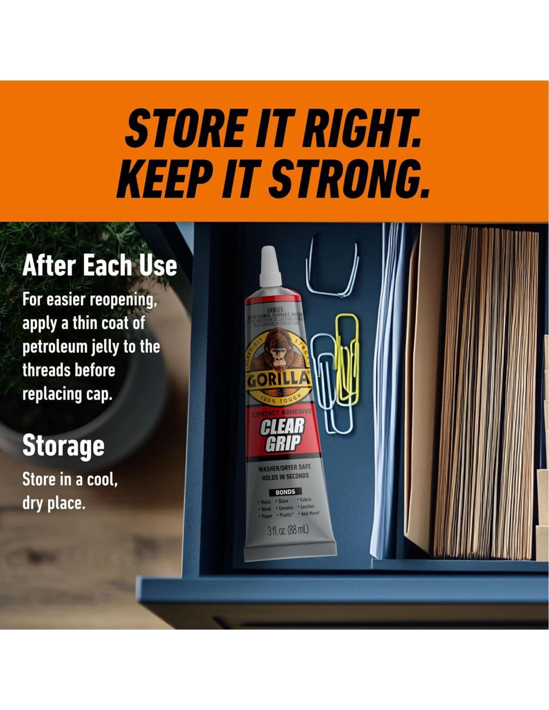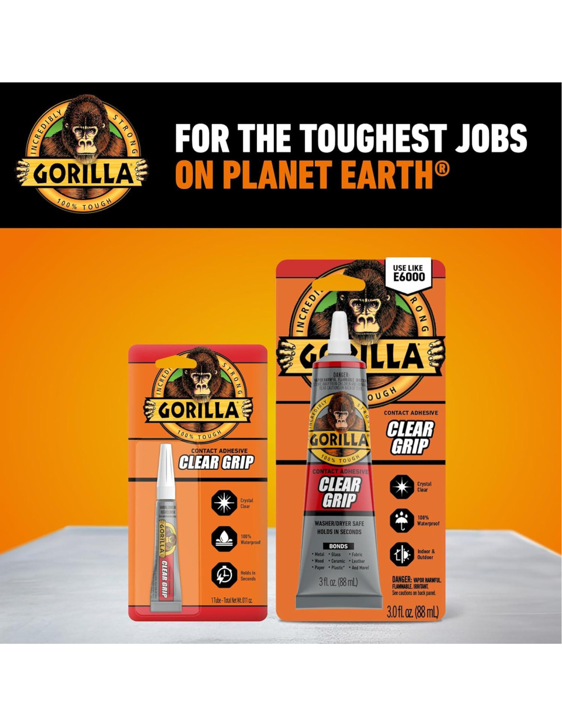 Gorilla Clear Grip es un adhesivo de contacto flexible, de secado rápido y completamente transparente que crea un fuerte vínculo permanente. Gorilla Clear Grip es pintable e impermeable, lo que lo hace ideal para proyectos tanto en interiores como en exteriores. ¡Construye, crea, repara! Eleva tus esfuerzos de bricolaje, reparación y manualidades con el Tubo de 3oz de Gorilla Clear Grip. Diseñado para aquellos que exigen fuerza, claridad y versatilidad, este adhesivo asegura que tus proyectos soporten la prueba del tiempo. Características Clave - Acabado Cristalino: Logra uniones invisibles y sin costuras, ideales para reparaciones y manualidades visibles. - Fórmula de Agarre Rápido: Une en segundos, sin necesidad de abrazaderas. - 100% Impermeable: Adecuado para aplicaciones tanto en interiores como en exteriores. - Fórmula Sin Goteo: Asegura una aplicación limpia y controlada sin desorden. - Flexible y Pintable: Se adapta al movimiento y se puede pintar una vez curado. - Vínculo Permanente: Ofrece un fuerte y duradero agarre para varios materiales.