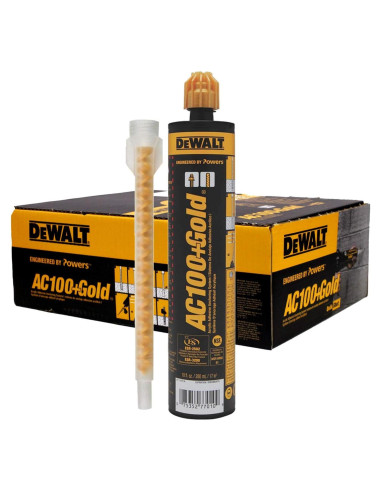 El AC100+ Gold es un sistema de anclaje adhesivo de viniléster de dos componentes. El sistema incluye adhesivo de inyección en cartuchos de plástico, boquillas de mezcla, herramientas de dispensación y equipo de limpieza de agujeros. El AC100+ Gold está diseñado para unir varillas roscadas y elementos de barra de refuerzo en agujeros perforados en materiales base de concreto y mampostería. Listados de Código: ICC-ES ESR 2582 - Categoría 1, Concreto Agrietado y No Agrietado Aplicaciones y Usos Generales: Unión de varillas roscadas y barras de refuerzo en concreto endurecido y mampostería Evaluado para su uso en concreto seco y saturado de agua, incluyendo agujeros llenos de agua Apto para resistir cargas en materiales base de concreto agrietado o no agrietado para casos donde se aplican teoría y criterios de diseño de anclajes Puede ser instalado en un amplio rango de temperaturas de materiales base Calificado para carga sísmica y de viento Características y Beneficios: Diseñado para su uso con elementos de hardware de varillas roscadas y barras de refuerzo Rendimiento consistente en concreto de baja y alta resistencia (1723 a 5868 kPa) Evaluado y reconocido por rendimiento de congelación/descongelación Evaluado y reconocido para una variedad de incrustaciones en aplicaciones interiores y exteriores Fórmula versátil de bajo olor con tiempo de curado rápido Evaluado y reconocido para cargas a largo y corto plazo Las boquillas de mezcla proporcionan adhesivo en proporción y ofrecen un método de entrega simple en agujeros perforados El diseño del cartucho permite múltiples usos utilizando boquillas adicionales