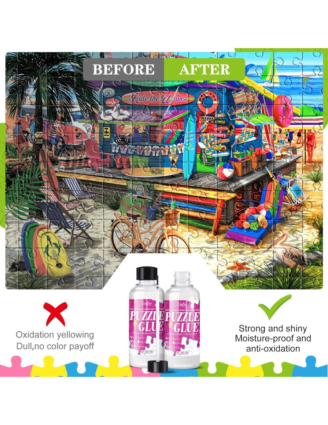 - FÁCIL DE USAR - Nuestro kit de montaje de rompecabezas incluye 2 botellas de pegamento con aplicadores de precisión y 2 brochas adicionales. Primero, usa el aplicador de precisión para fijar los espacios entre las piezas del rompecabezas. Luego, aplica el pegamento de manera uniforme sobre la superficie usando la brocha. El pegamento se seca en 1-2 horas (recomendamos 2-3 capas para obtener resultados óptimos). El pegamento de gran capacidad es adecuado para rompecabezas de 1000/3000/5000 piezas.