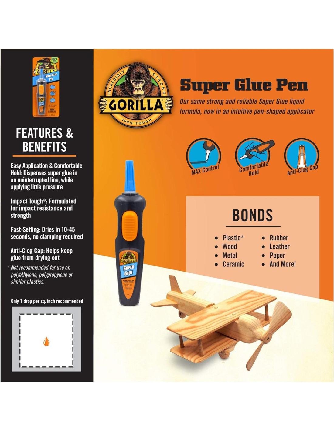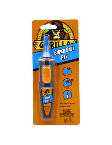 Nuestra misma fórmula de Super Glue líquida fuerte y confiable, ahora en un aplicador en forma de bolígrafo intuitivo. El Bolígrafo de Super Glue Gorilla dispensa super glue en una línea continua, proporcionando el máximo control mientras se adapta cómodamente a la mano. Formulado para resistencia al impacto y fuerza. Se seca en 10-45 segundos, sin necesidad de sujeción. La tapa anti obstrucción ayuda a mantener el pegamento sin secarse. Une plástico*, madera, metal, cerámica, goma, cuero, papel y más! (*No se recomienda su uso en plástico de polietileno o polipropileno.)