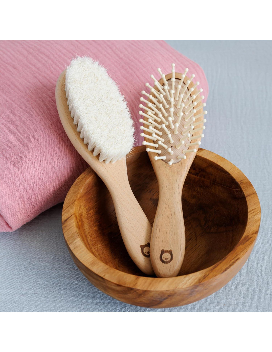 - Juego de cepillos para bebé de alta calidad - Este juego de cepillos para niños pequeños consiste en un cepillo de masaje con cerdas de bambú y un cepillo super suave con cerdas de pelo de cabra para proporcionar un cuidado excepcional del cabello del bebé.
