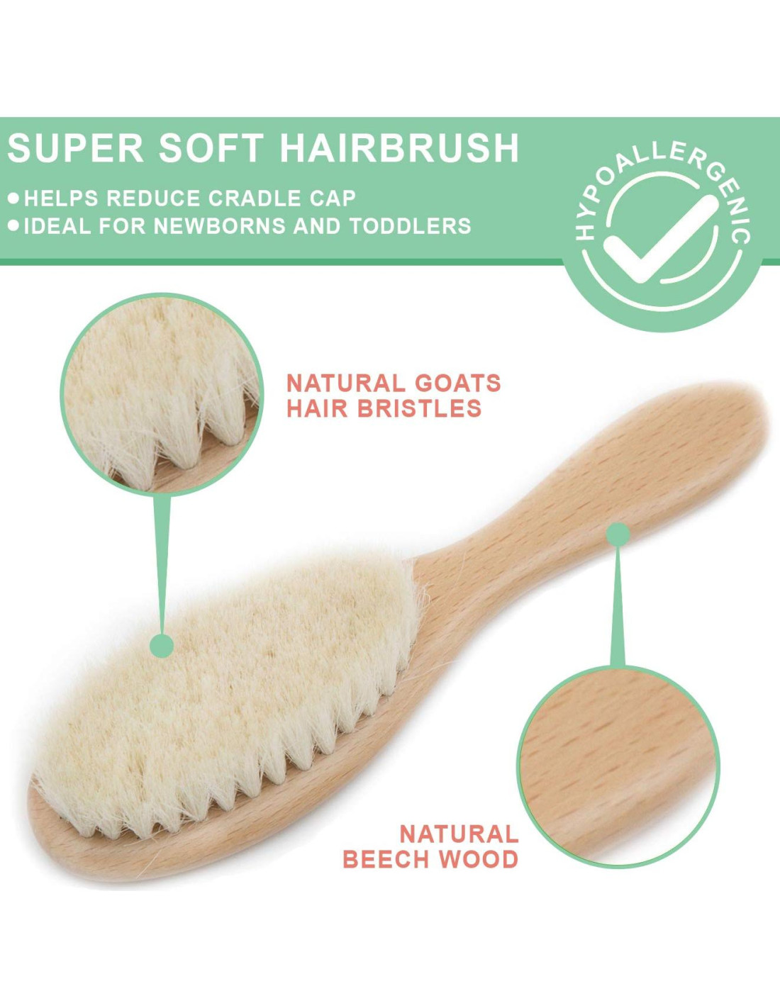 - CUIDADO NATURAL Y SEGURO: Juego de cepillos para bebés hecho de madera de haya maciza de alta calidad y pelo de cabra 100% natural ultra suave, este juego de cepillos y peines para cabello de bebé es antiestático e hipoalergénico para ayudar a calmar y suavizar el cuero cabelludo de tu bebé.
