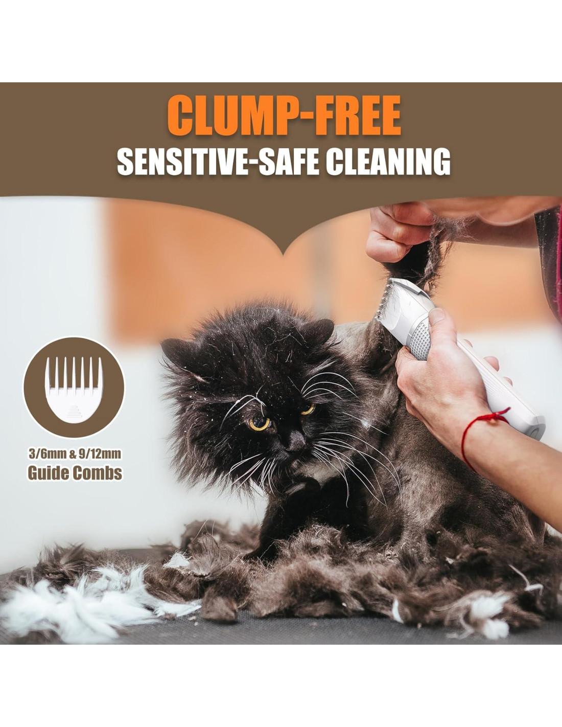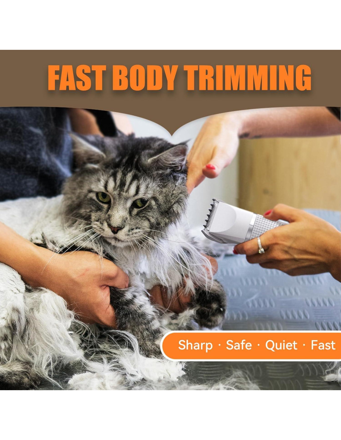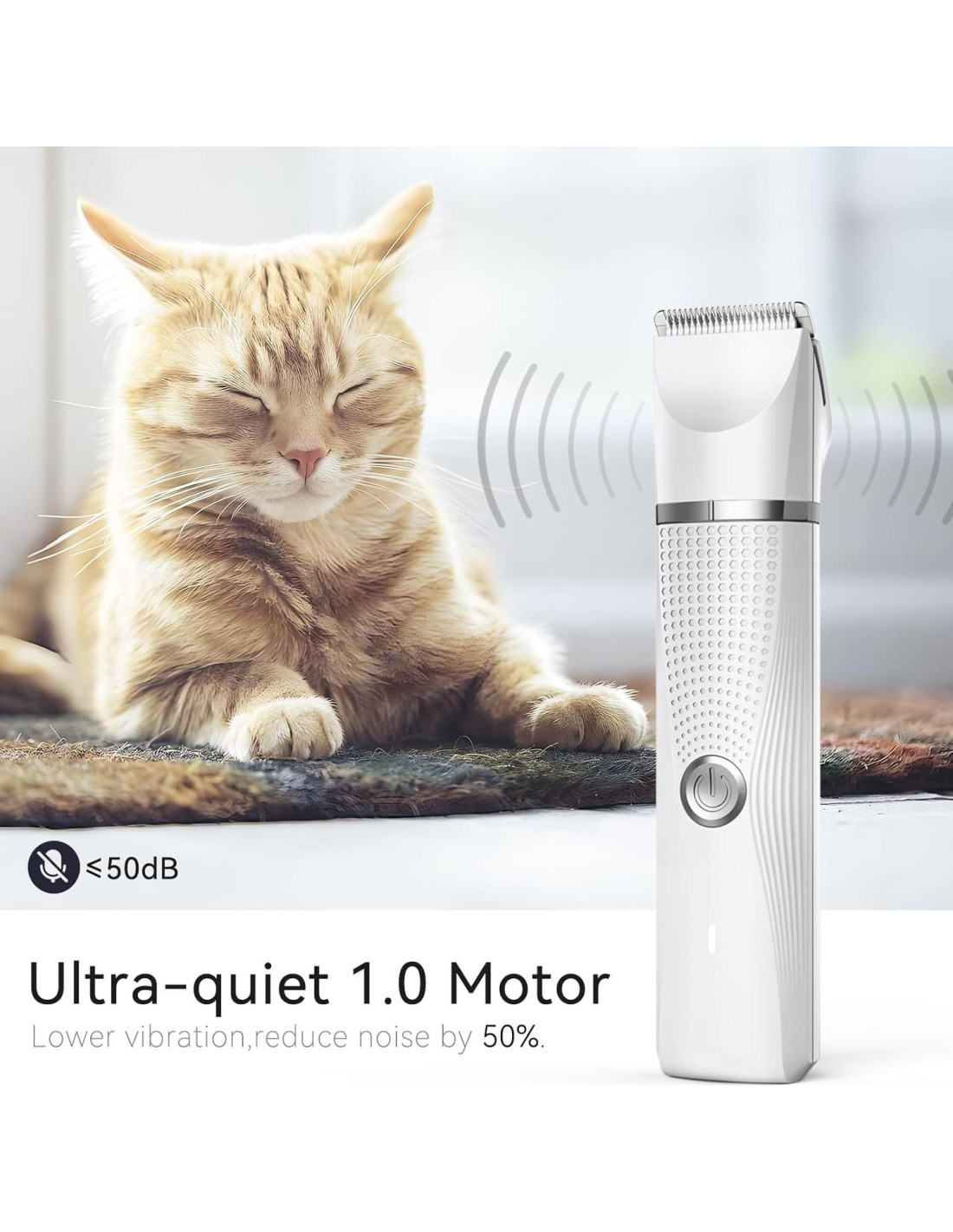 - Ultra-silencioso: El ruido de la cortadora de gatos silenciosa al trabajar es inferior a 50dp, lo que la hace ideal para gatos que son sensibles al ruido. Recorta las patas, cara, orejas, patas y otras áreas de tu querido felino sin causar miedo o ansiedad. Para gatos de pelo largo, primero recorta su pelo a la longitud adecuada con tijeras de acero y peines, luego usa la recortadora eléctrica 3 en 1 para el recorte del cuerpo para evitar tirones.