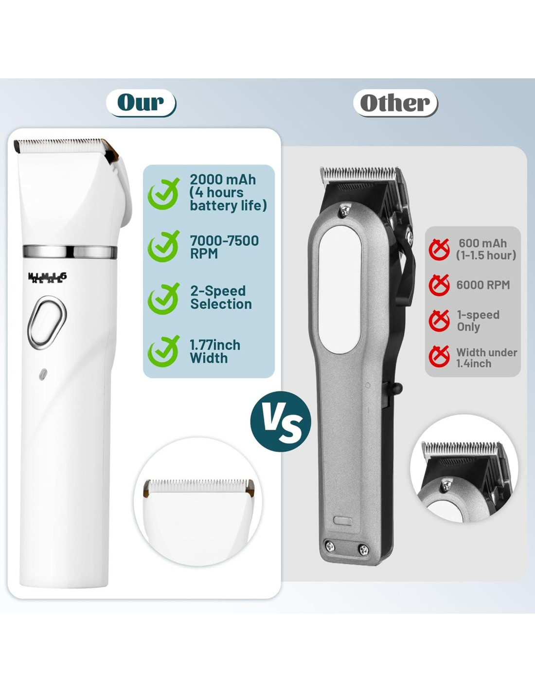 - Motor Potente y Uso Prolongado: Equipado con un motor potente, nuestras Cortadoras de Aseo ofrecen una velocidad de corte de 7000-7500 RPM. Viene con una batería de 2000mAh, ofreciendo hasta 4 horas de uso continuo. Este motor potente y uso prolongado aseguran un recorte rápido y suave sin obstrucciones de pelo e interrupciones en el corte de aseo.