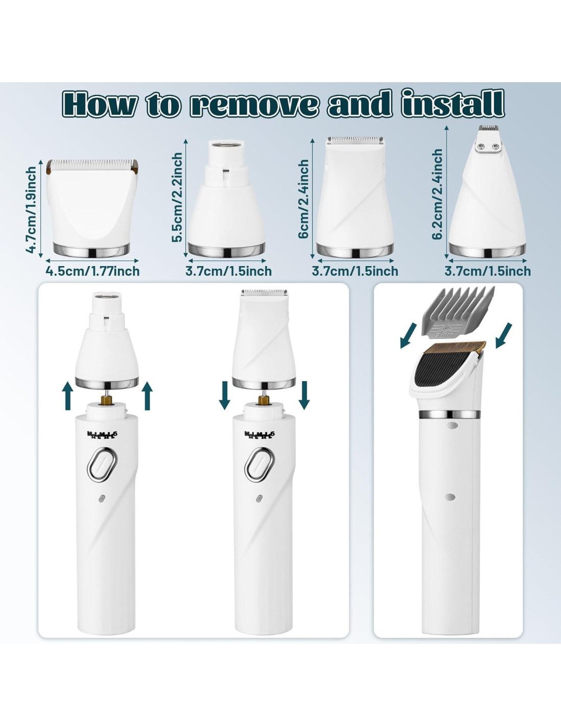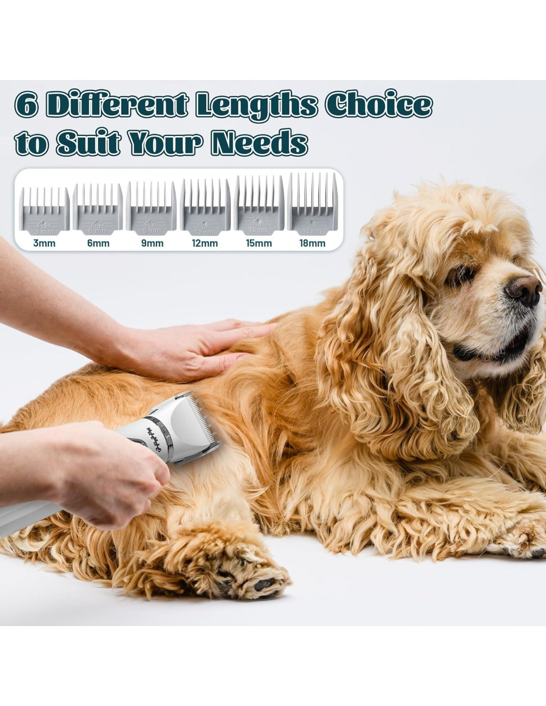 - En el Paquete: El set viene con 3 accesorios de cuchilla intercambiables (cuchilla de tijera curva, cuchilla de molienda de uñas, cuchilla de pedicura), 6 diferentes tamaños y longitudes de recortadoras de posicionamiento de pelo (3mm, 6mm, 9mm, 12mm, 15mm, 18mm), tijeras*1, peine*1, cepillo*1, cable USB*1, manual de instrucciones*2. Puede recortar rápida y suavemente la longitud de la parte correspondiente del pelo de la mascota, ¡siendo un gran ayudante de aseo!