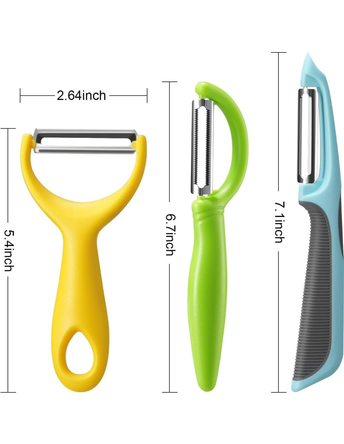 - Una combinación perfecta: Este juego viene con tres estilos de peladores de papa. El pelador de verduras con cuchilla estándar elimina rápidamente las verduras de piel dura, ideal para papas, pepinos y zanahorias. Y el pelador en Y para pieles extra gruesas, como la calabaza, el pelador en I con diseño de agujero, puede eliminar fácilmente las manchas malas de frutas y verduras. Recibirás 1 pieza extra de pelador de naranja y 1 pieza de cepillo, satisfaciendo tus necesidades en la cocina en la vida diaria.