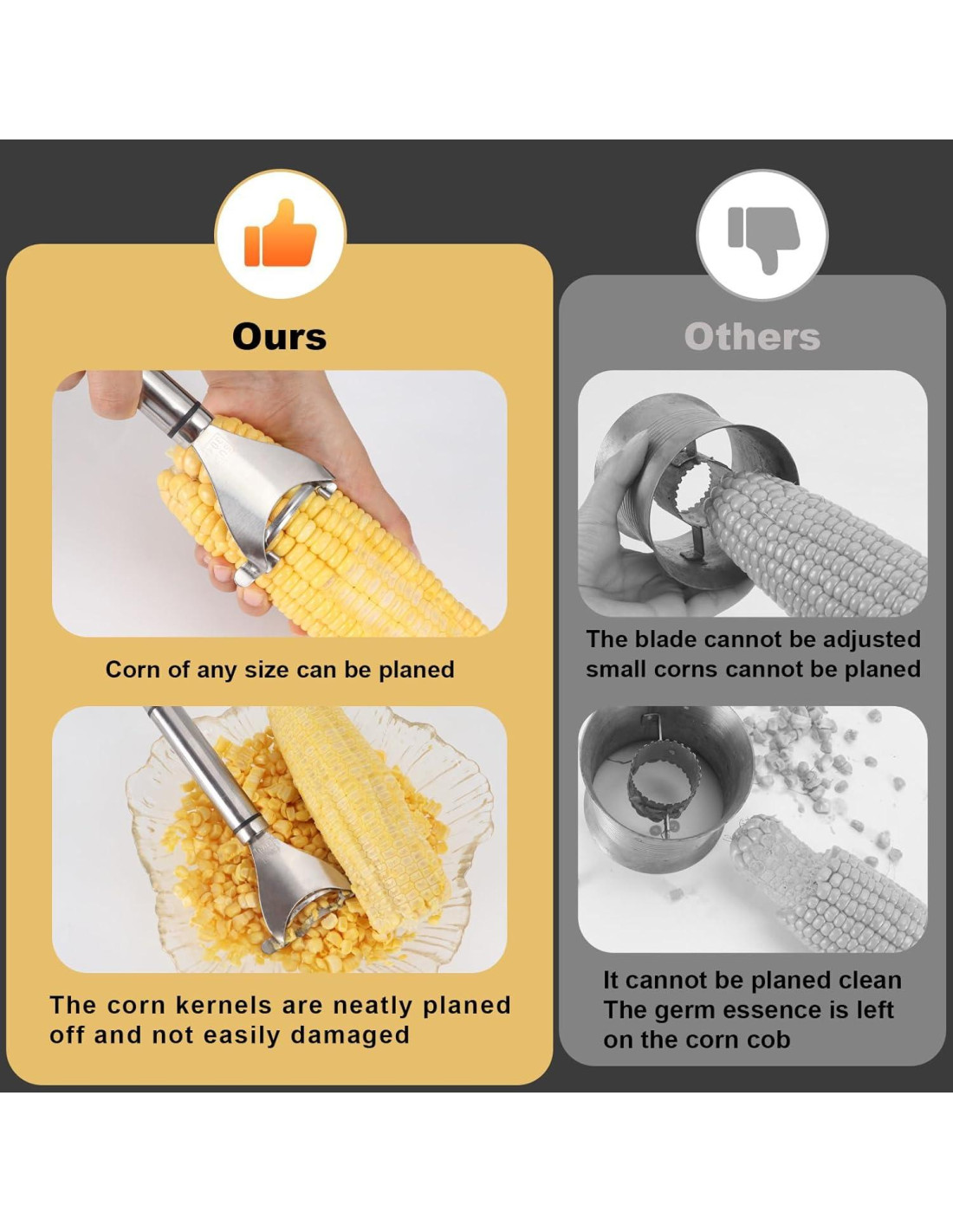 - NO SE REQUIEREN HABILIDADES: El pelador de mazorca puede quitar los granos de maíz en un ancho de tres filas a la vez, tira del mango y los granos de maíz caerán ordenadamente. El mango alargado y engrosado mantiene tu mano a salvo de la cuchilla. El agarre cómodo hace que desgranar sea fácil.