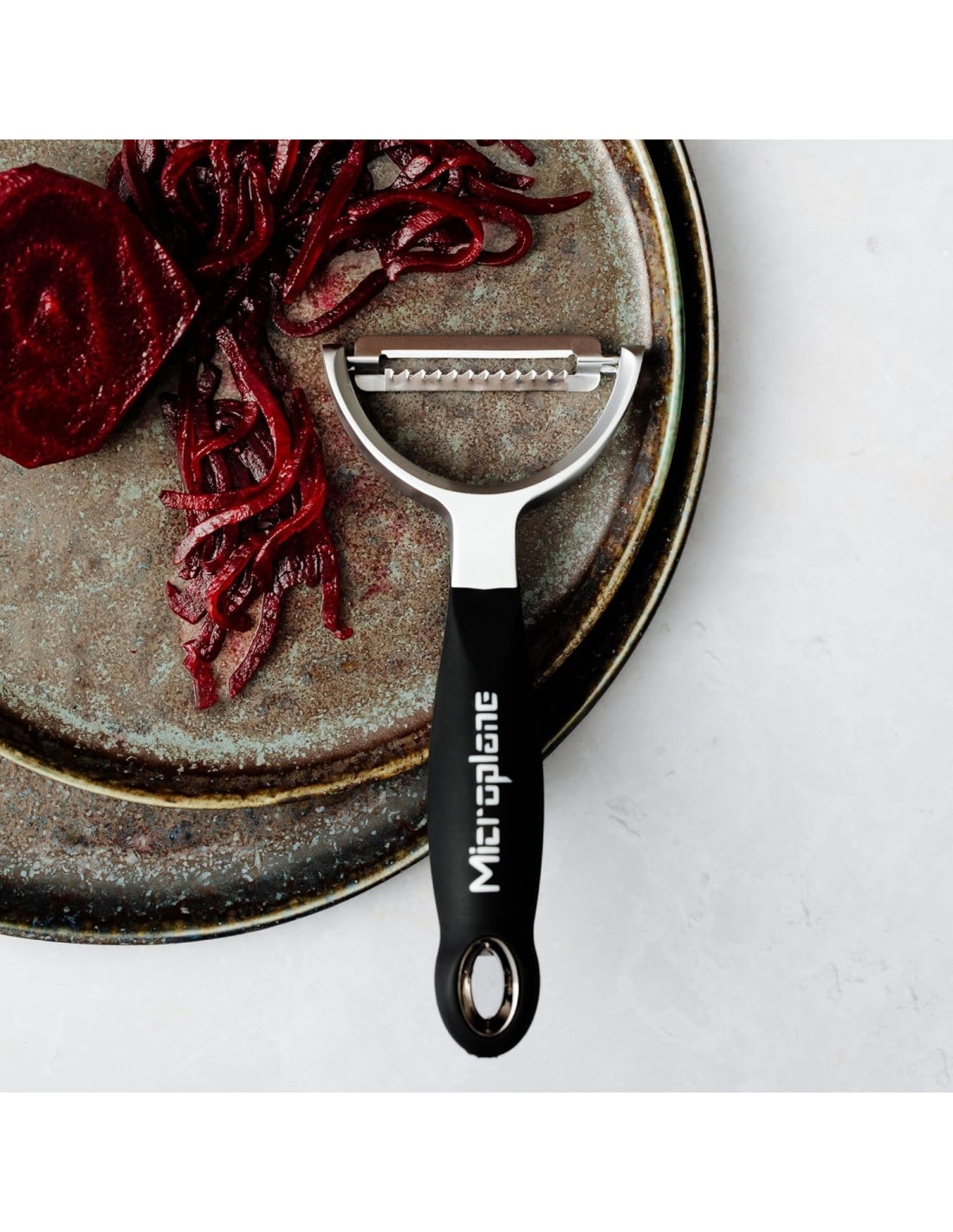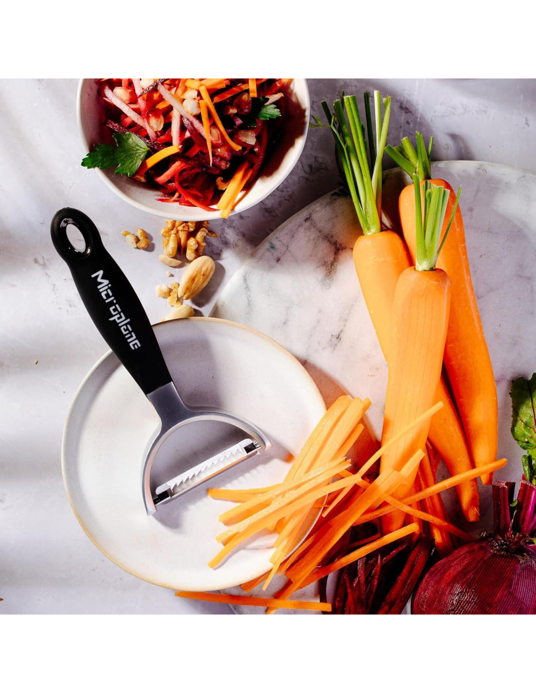 El pelador juliana en forma de Y. Su cuchilla de juliana de acero inoxidable es ultra afilada para cortar perfectamente tiras juliana / vegetales. Para cocinar un wok o una sartén de verduras sin esfuerzo mezclando varias verduras (zanahoria / calabacín / batatas...), para hacer wraps o rollos de primavera, para hacer una canasta de verduras crudas para disfrutar con salsas, el pelador juliana te ahorra el trabajo mientras te ahorra tiempo precioso.