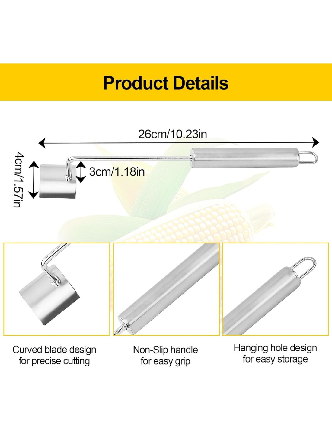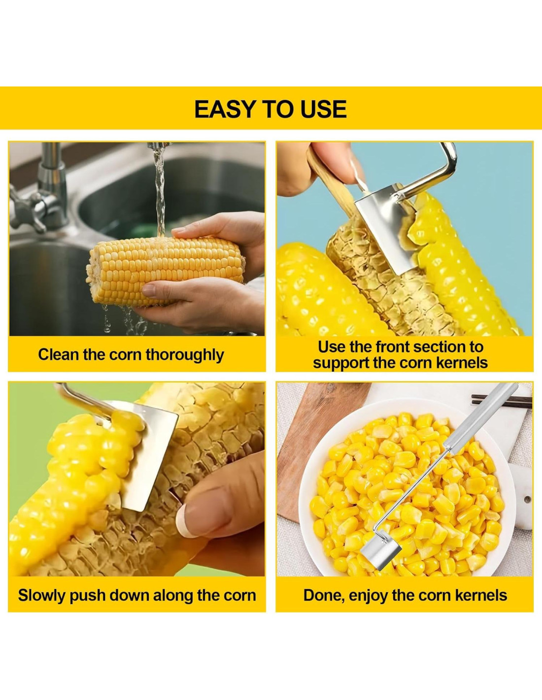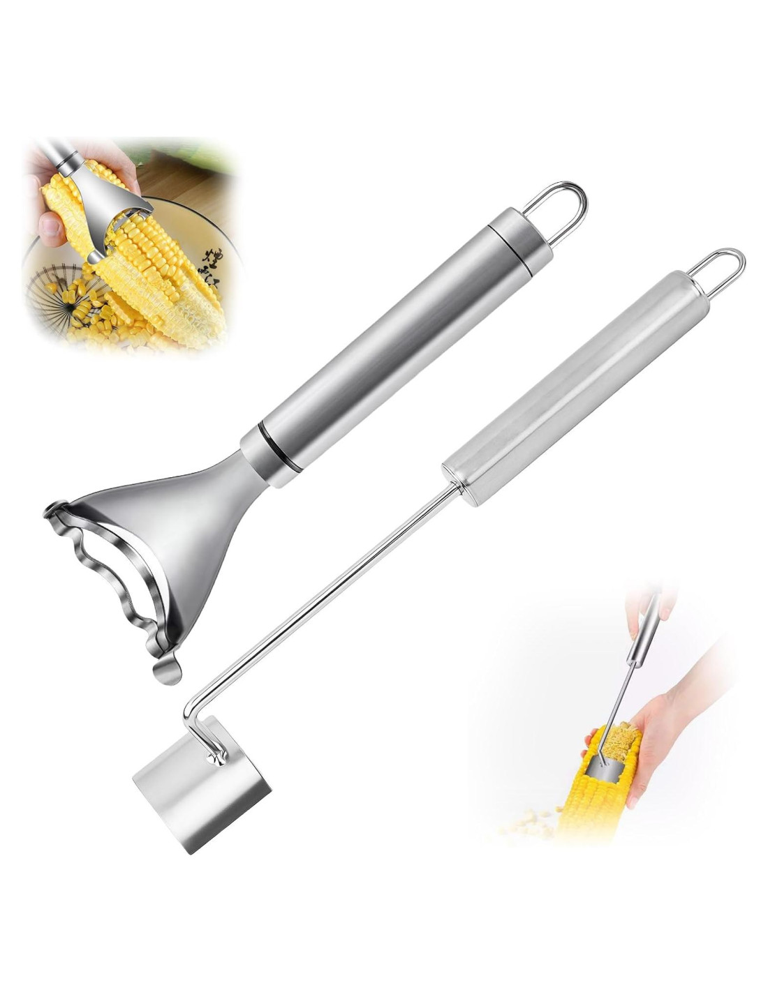 - Diseño de Doble Función: Este juego incluye tanto un raspador de maíz como un pelador de maíz. El raspador es perfecto para eliminar granos del maíz cocido, mientras que el pelador raspa sin esfuerzo los granos del maíz crudo. Juntos, hacen que preparar maíz para cualquier receta sea muy fácil.