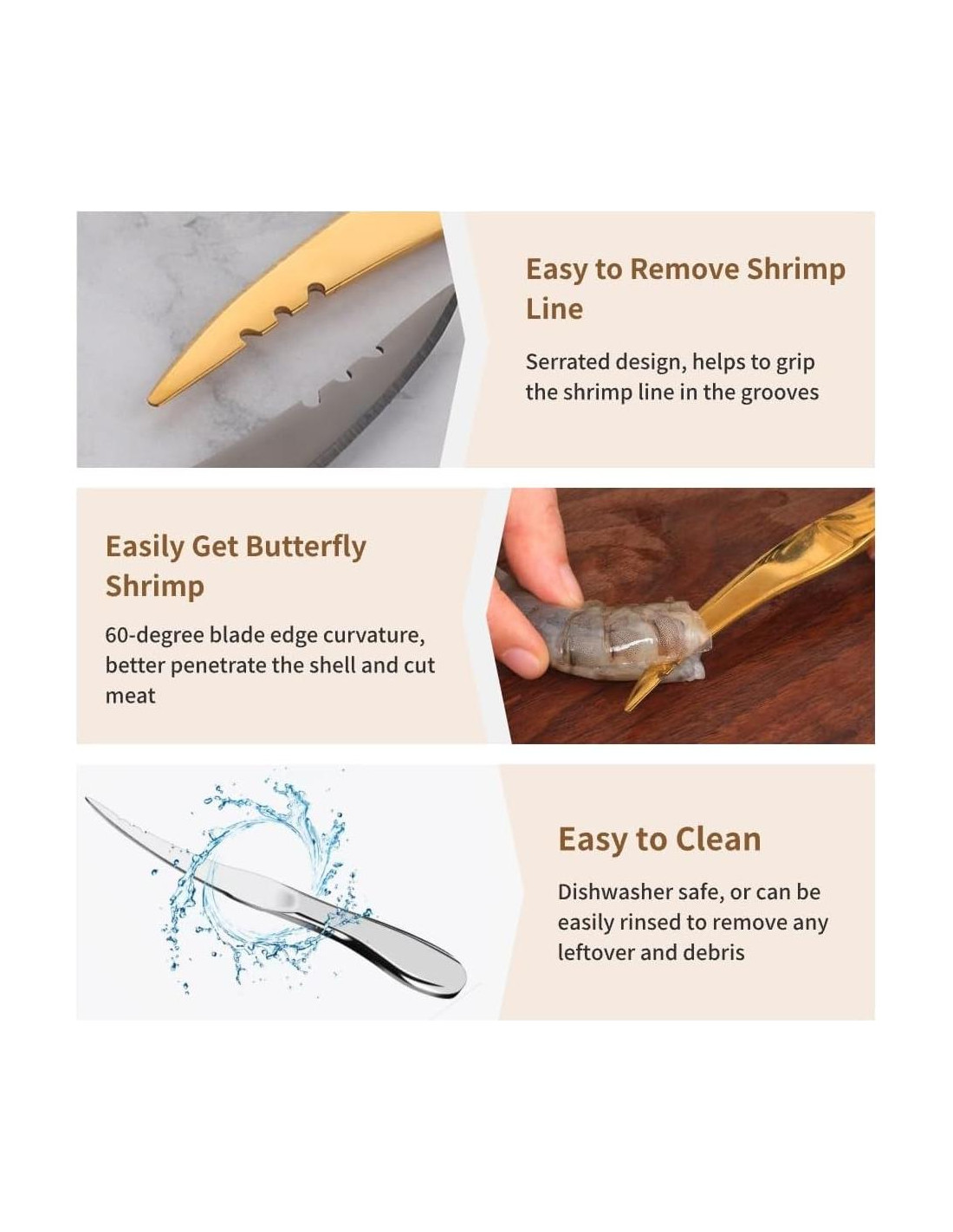- [Desvenar y Mariposa Camarones Fácilmente] : Con su diseño único de sierra puntiaguda, este pelador de camarones asegura un agarre firme y una eliminación sin esfuerzo de las venas de los camarones, eliminando las molestias de la preparación de camarones. La hoja curva afilada sigue los contornos naturales del camarón, permitiéndote crear rápidamente y con precisión hermosos camarones mariposa sin dañar la carne. Fácil de limpiar y desvenar todos los tipos de camarones: langostinos, langosta, crudos, cocidos, grandes, pequeños y camarones descongelados.