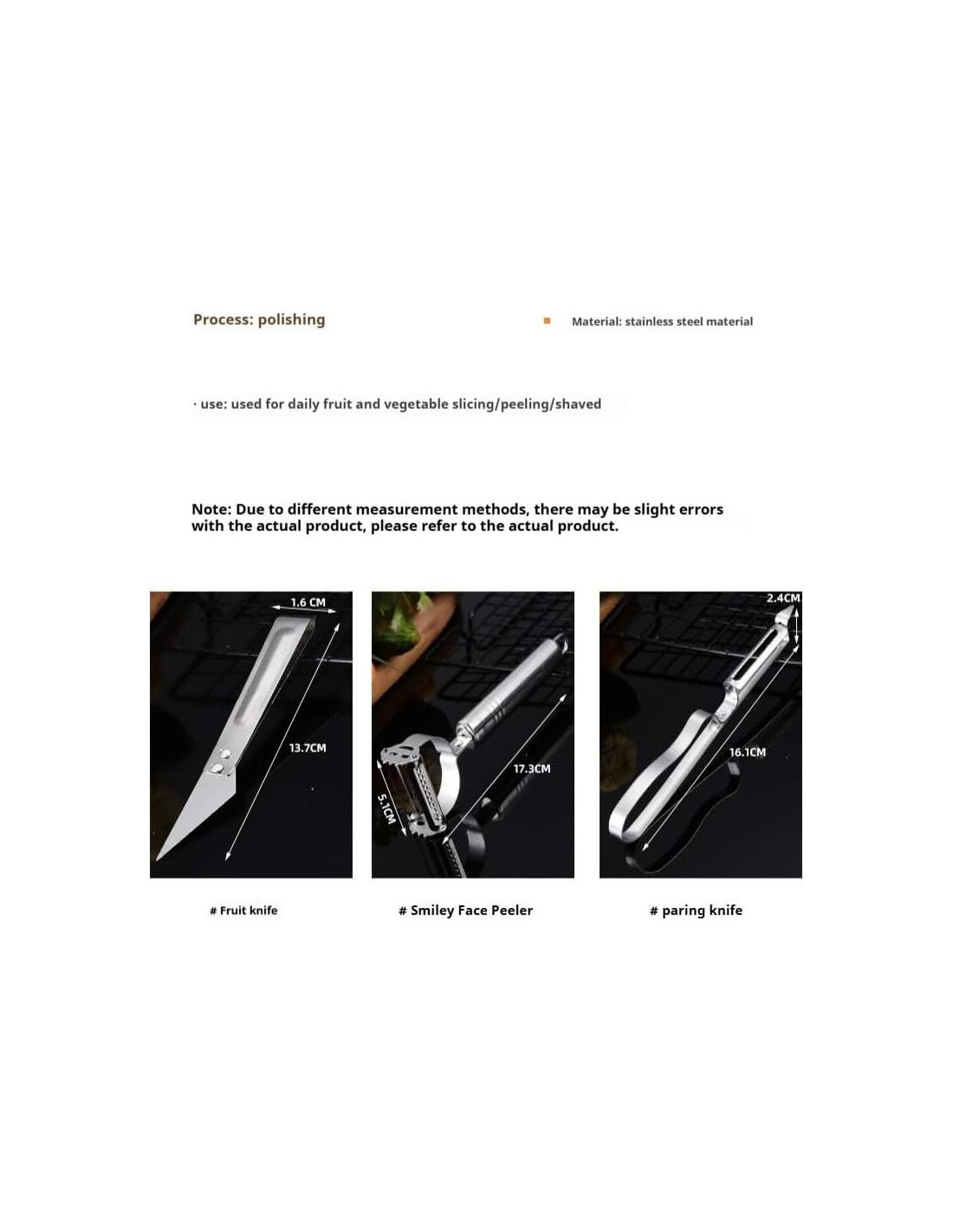 Este versátil juego de 3 piezas incluye un pelador de patatas de acero inoxidable, un raspador de alambre con cara sonriente y un cuchillo de frutas. Perfecto para tareas de cocina diarias, maneja eficientemente todo tipo de frutas y verduras, como patatas, zanahorias y repollo. Ideal para entusiastas de la cocina que buscan el mejor cortador de verduras, rebanador mandolina o pelador de verduras para mejorar la eficiencia.