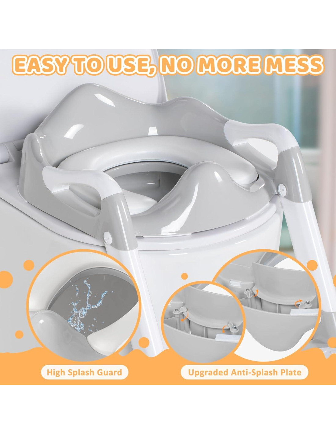 - Diseño Plegable y Fácil Montaje: Cuando no esté en uso, puede plegar el asiento de entrenamiento para el baño de los niños y guardarlo en un rincón, lo cual es práctico y ahorra espacio. El protector contra salpicaduras elevado se puede instalar y quitar fácilmente. Con las instrucciones detalladas e ilustradas, puede montar la silla para el baño en solo unos minutos.
