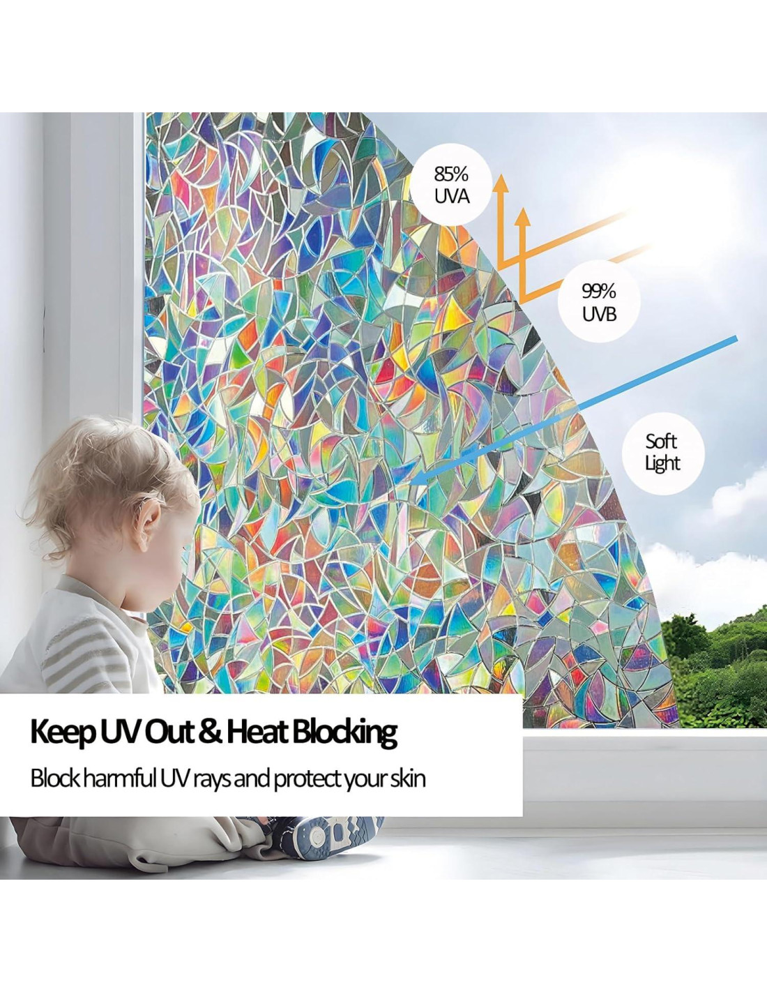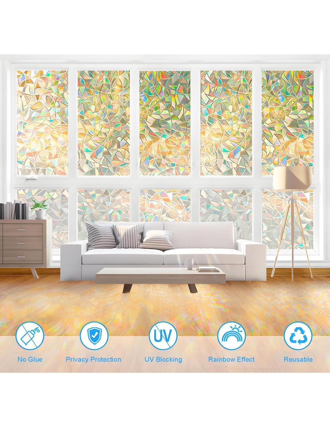 - Protección UV: Esta película para ventanas arcoíris puede bloquear la mayoría de los rayos ultravioleta y el deslumbramiento, protegiendo tu piel y ojos. Al mismo tiempo, puede retrasar la decoloración y el envejecimiento de los muebles del hogar. La luz exterior que pasa a través de esta película para ventanas se volverá suave, haciéndote sentir cómodo.