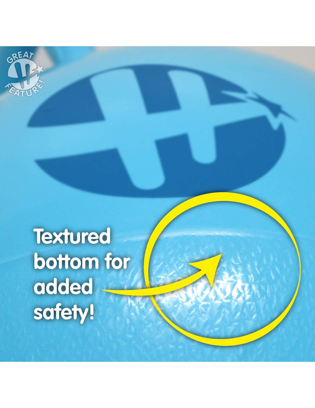 - El material de vinilo duradero se mantiene inflado y rebotador mientras los niños saltan y rebotan casi en cualquier lugar. El mango texturizado y resistente proporciona un agarre seguro.