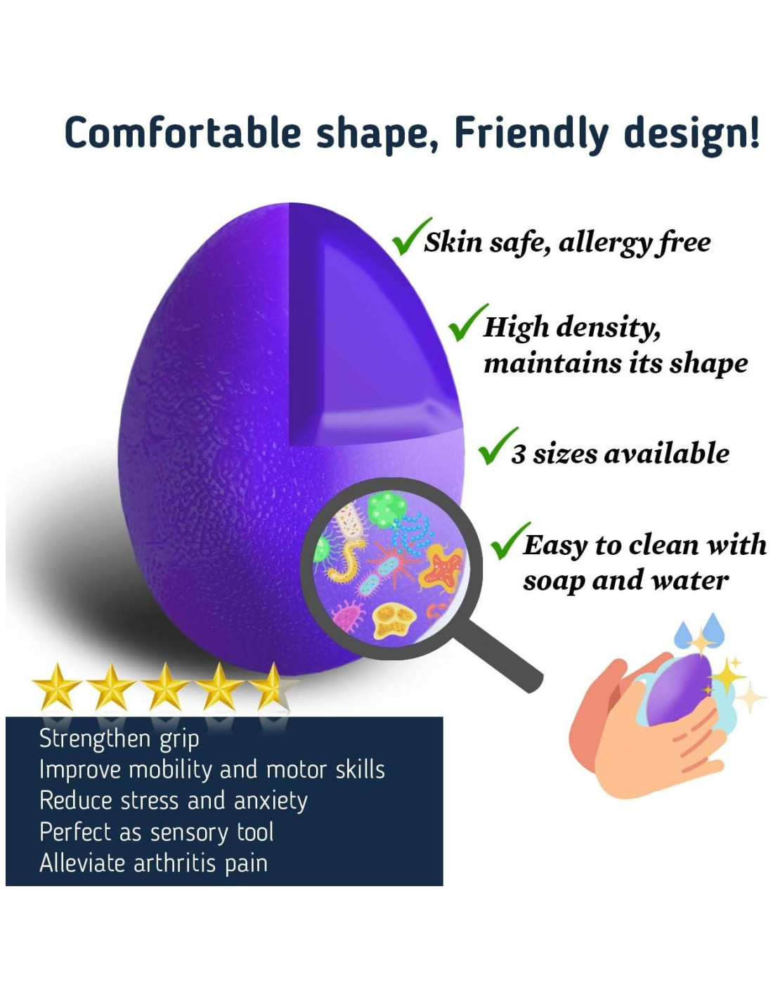 - DISEÑO AMIGABLE Y DURABILIDAD: Con forma de huevo para un ajuste cómodo en tus manos. Hecho de goma termoplástica segura para la piel (TPR). ¡Tres opciones de tamaño! XS: 5.1 cm x 3.3 cm; Pequeño: 6.4 cm x 4.4 cm; Grande: 7.6 cm x 5.6 cm. Menos desordenado que la masilla de terapia. Fácil de limpiar del polvo y la suciedad.