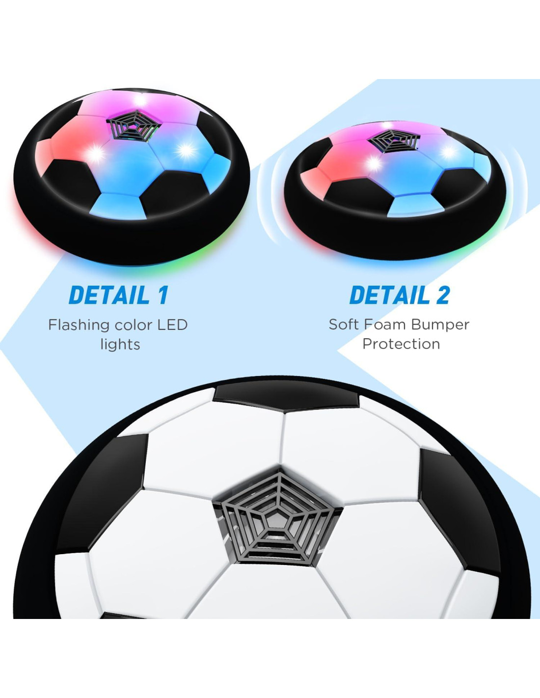 - Pelota de Fútbol LED Duradera - Con un motor de rendimiento mejorado, la pelota flotante ahora es más confiable y flota más alto, asegurando una estabilidad de deslizamiento de alta calidad y durabilidad a largo plazo. Las luces LED intermitentes con colores cambiantes ayudan a atraer la atención de los niños y hacen que el juego nocturno de tu hijo sea ilimitado.