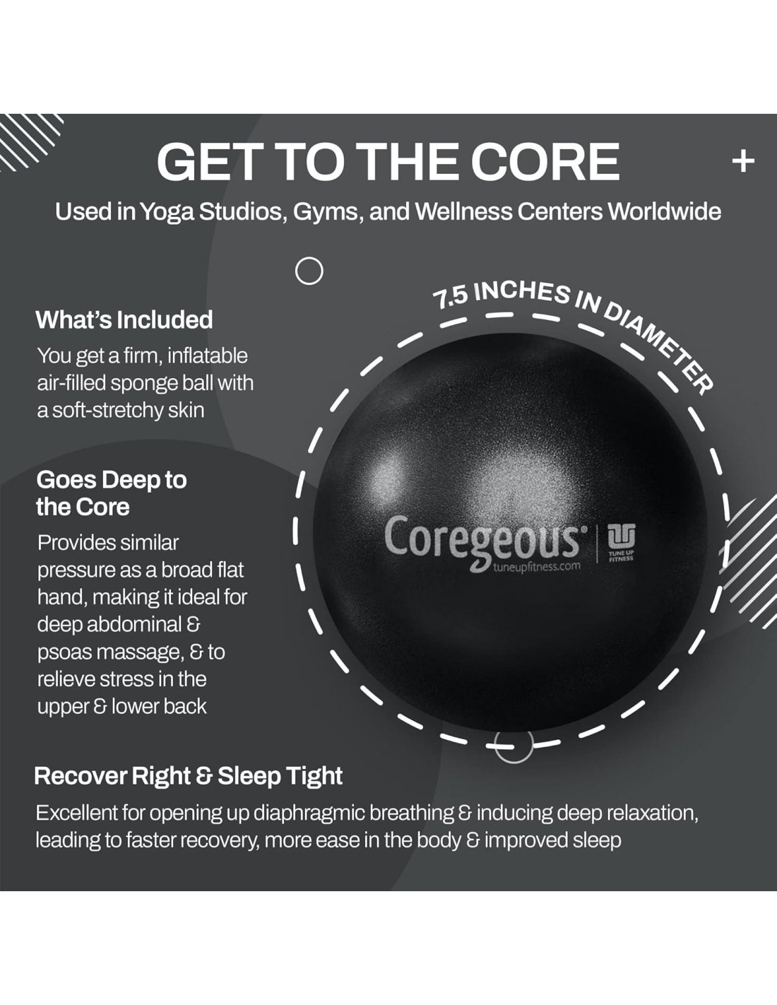 - SIENTE MÁS CÓMODO EN TU CUERPO: Excelente como una pelota de estiramiento abdominal y de psoas, proporciona alivio del dolor de espalda baja sin tener que girar o activar los músculos de la espalda y ayuda a la eliminación para proporcionar alivio del estreñimiento. La Pelota Coregeous también ayuda a mejorar la respiración diafragmática y fomenta al cuerpo a liberar el estrés, preparando el escenario para la recuperación posterior al entrenamiento, la relajación profunda y un sueño reparador.