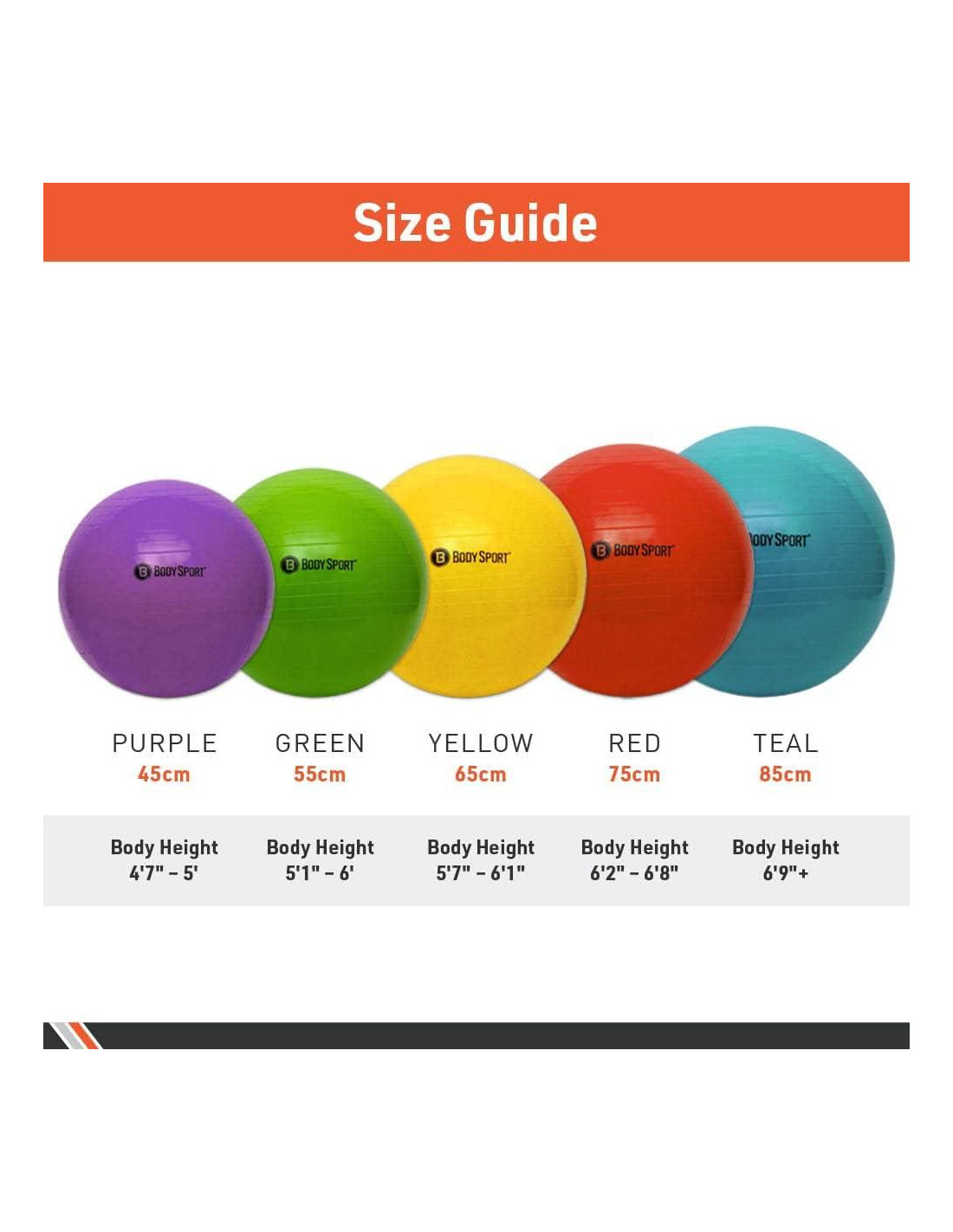 - MÚLTIPLES TAMAÑOS DISPONIBLES. Esta bola de fitness versátil está disponible en cinco tamaños diferentes, incluyendo 45 cm (púrpura), 55 cm (verde), 65 cm (amarillo), 75 cm (rojo) y 85 cm (verde azulado).