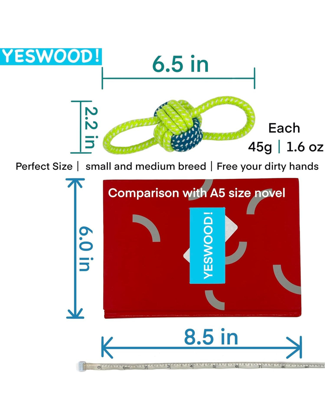 Consiste en 4 pelotas de perro casi indestructibles con juguetes de cuerda. Fue diseñado originalmente para el juego de tira y afloja y también para el juego de buscar. Para la mayoría de los perros pequeños y medianos, esta pelota puede ser fácilmente mordida por el perro. Para muchos perros grandes, este tamaño también es justo para ellos durante la etapa de cachorro. Para muchos perros x pequeños, esta esfera de 5.58 centímetros de diámetro no es demasiado grande, y la suave cuerda de algodón puede limpiar sus dientes.