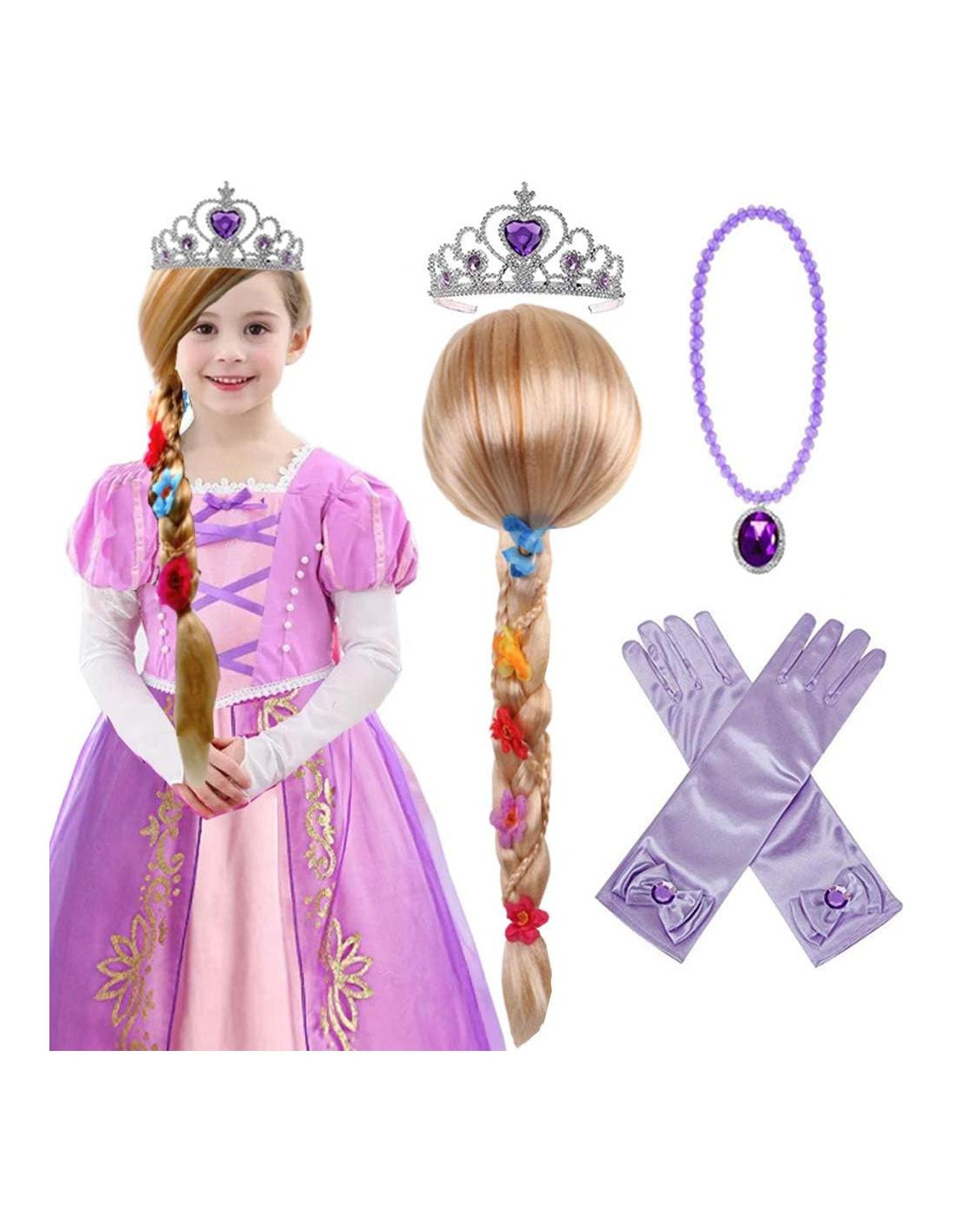 - Paquete de peluca de Rapunzel incluido: 1 peluca de Rapunzel, 1 tiara de princesa, 1 collar, 1 par de guantes. Tu hija puede parecerse a la Princesa Rapunzel con esta hermosa peluca.