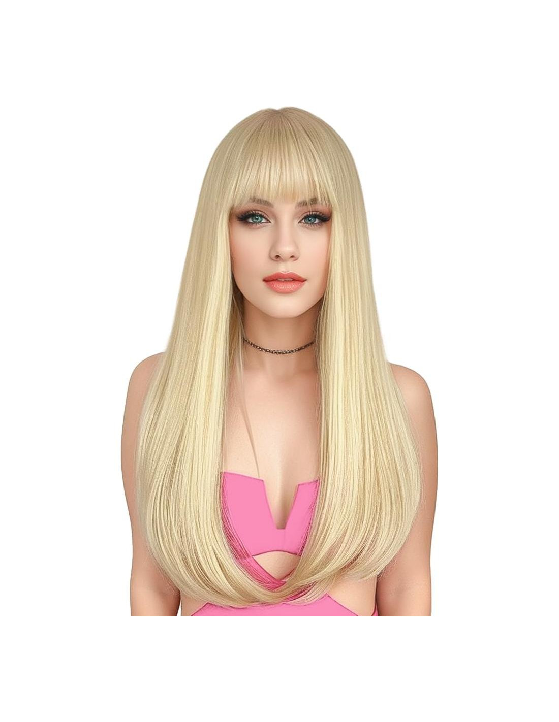 - [Peluca Rubia con Flequillo] Pelucas largas y rectas para mujeres caen naturalmente hasta el pecho y vienen con flequillo que puede ocultar perfectamente tu línea de cabello. La peluca rubia se adapta a cualquier forma de cara y edad. Esta peluca sintética resistente al calor se puede peinar con herramientas de calor a menos de 150C (300F).