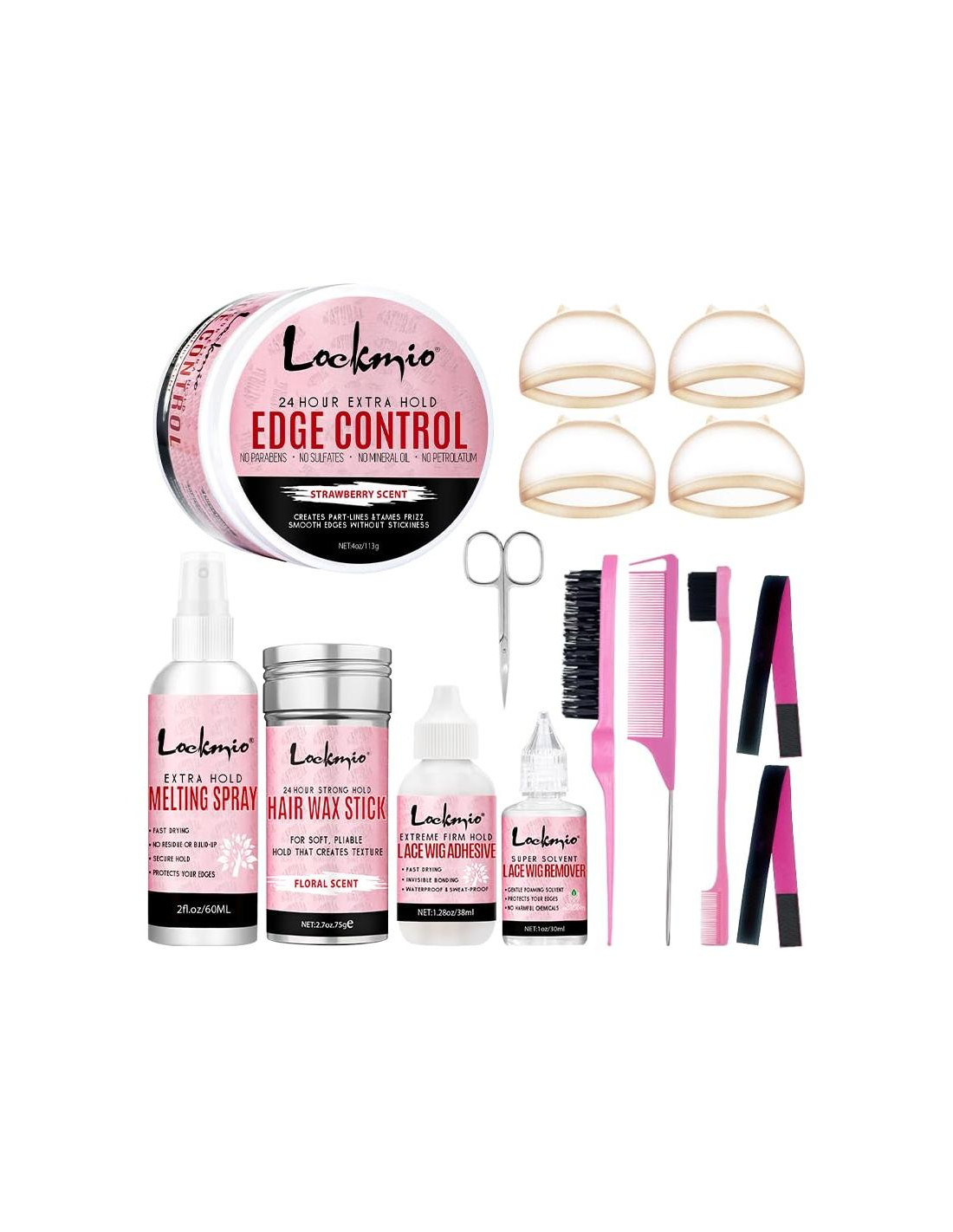 - [Kit completo de instalación de peluca de 15 piezas] Mejora tu juego de pelucas con nuestro completo kit de pegamento para pelucas. Este paquete incluye: 1pc 59 ml spray de fusión + 1pc 76.5 g barra de cera para cabello + 1pc 113.4 g control de bordes + 1pc cepillo de bordes + 1pc cepillo de cola de rata + 1pc cepillo de cerdas + 1pc pegamento para pelucas + 1pc removedor de pegamento para pelucas + 2pcs bandas elásticas para pelucas + 4pcs gorras para pelucas + 1pc tijeras.