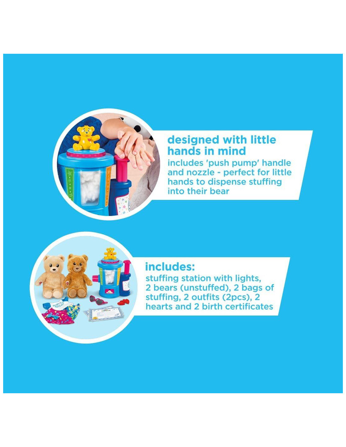 - INCLUYE: Estación de relleno con luces, 2 x osos (sin rellenar), 2 x bolsas de relleno, 2 x atuendos (2 piezas), 2 x corazones y 2 x certificados de nacimiento.