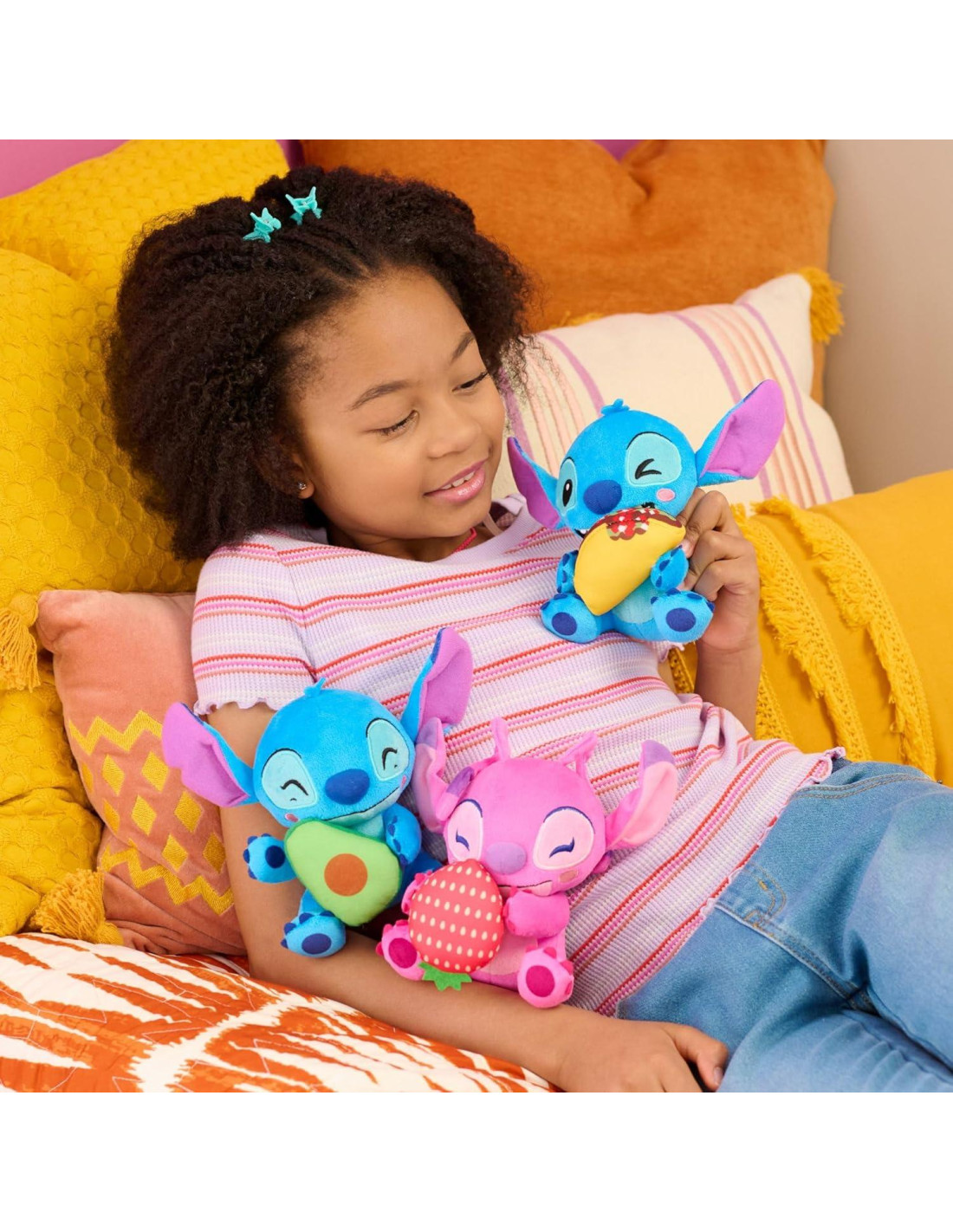 - Delicias de Snack: Colecciona todos los juguetes de peluche pequeños de Disney con snacks: Stitch con un taco, Stitch con un aguacate y Angel con una fresa.